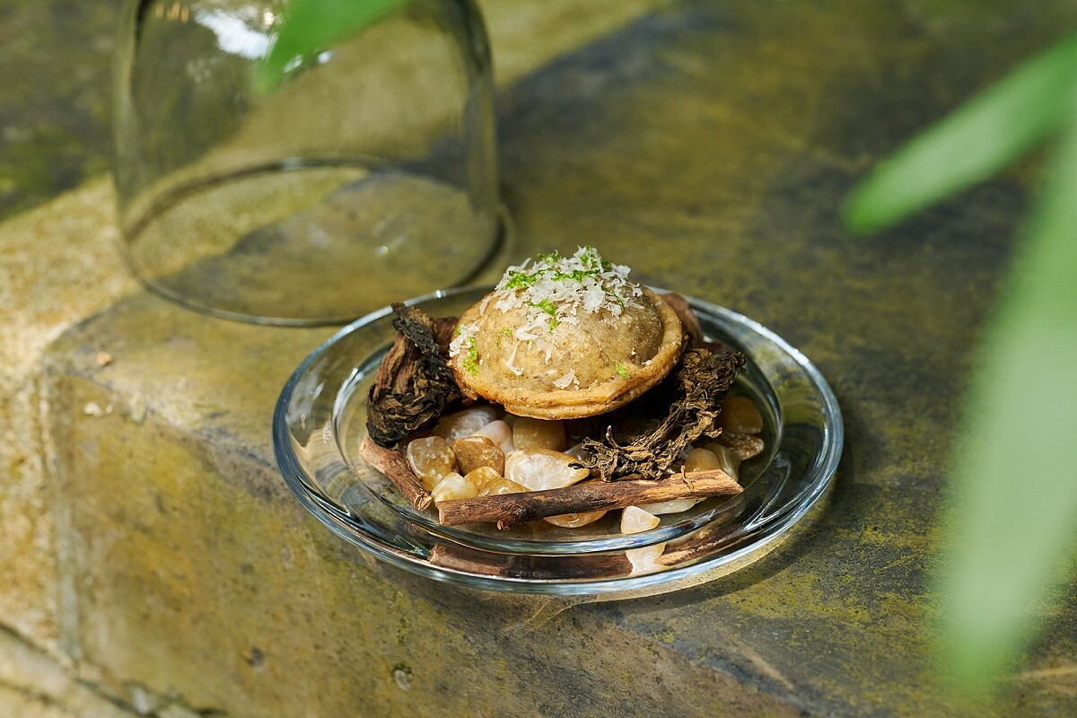 料理來自主廚在澳洲工作時熟悉的國民美食「肉派」,回到臺灣後,結合三義客庄常見的梅干扣肉,轉化為一道帶有地方語彙的鹹派。內餡以梅干菜與豬五花近1:1比例製作,並加入豬高湯,讓風味在濃郁鹹香之中仍保有濕潤口感。外層酥皮混入梅干菜粉與帕瑪森起司,油炸後再刨上起司、點綴綠檸檬皮,收出帶有發酵氣息與清亮酸香的尾韻。