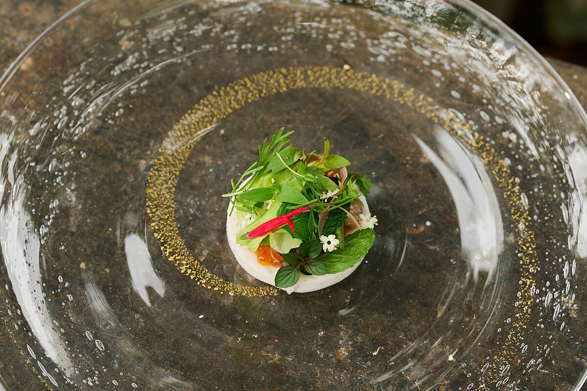 這道料理所使用的器皿由日本玻璃造型藝術家田中英樹特別訂製。延續「黎森」的整體設定,器皿並不追求強烈存在感,而是刻意退後,讓視覺焦點回到食物本身。玻璃質地呈現透明與純淨感,細微氣泡與金箔刷紋隱約流動,在光線下帶出低調層次,同時也呼應原木大桌的自然紋理,使餐點在不被干擾的狀態下被更清楚地看見。