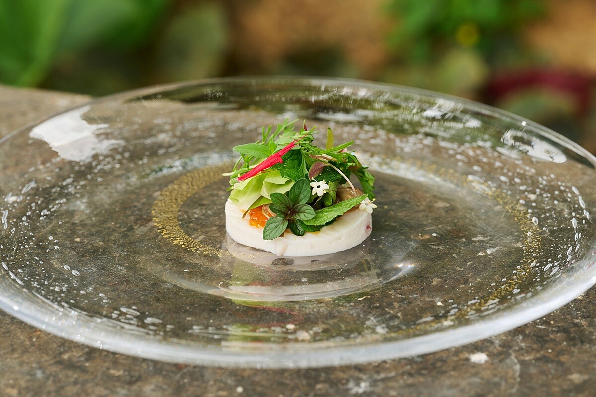 冷前菜以花枝慕斯為基底,向臺灣辦桌經典「五味章魚」致意,重新組合熟悉的臺式風味。底層鋪上細緻滑順的花枝慕斯,上方堆疊鹹蛤仔、自製發酵辣醬與山葵花枝醬,並加入煙燻龍眼乾與鱒魚卵,讓鮮味、鹹香與微辣之間形成多層次交錯。其間點綴自製鹹粿粒,增添口感變化。最上層搭配莊園現採香草與綜合生菜,拌入油醋的清爽酸香,與下方濃郁海味形成對比,讓整體風味在熟悉與細膩之間取得平衡。