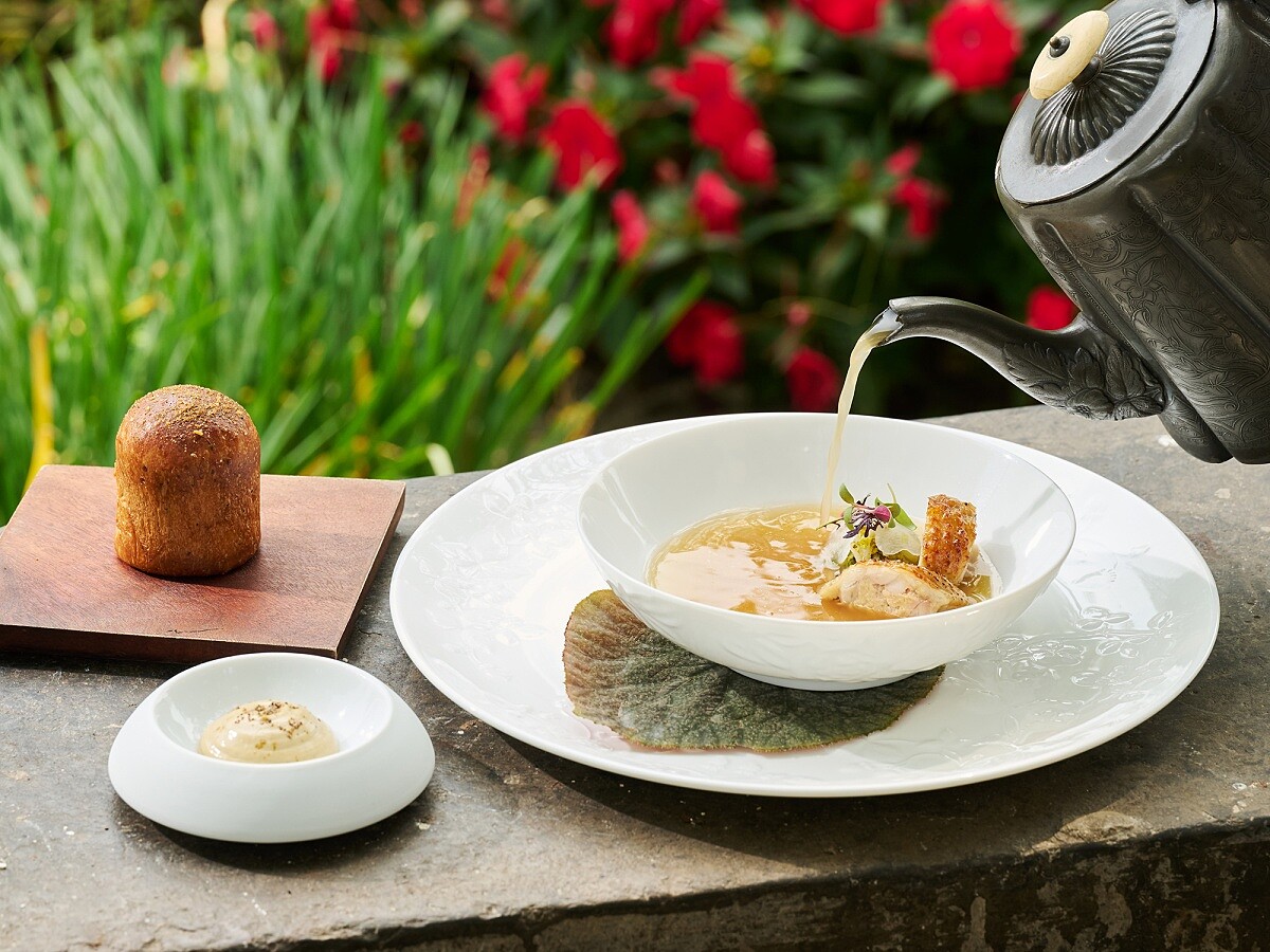選用高雄大野山雞,將去骨雞中翅填入雞肉慕斯與鴨肝,經炭火烤製後,帶出油脂與肉香交織的濃郁風味。盤中搭配炭燒娃娃菜與龍鬚菜,並點綴糖漬檸檬丁與醋漬白蘿蔔片,以蔬菜的焦香與酸香拉開層次,讓整體風味更為平衡。 一旁附上的熱湯則是這道料理的另一個重點。以雞骨、豬大骨、雞腳、雞翅尖與金華火腿細火熬製,加入苗栗在地的客家酸柑茶與杭菊,讓湯體在濃厚基底之上,多了一層溫潤且帶有地方氣息的清香。建議先品嚐熱湯,再搭配雞翅一同享用,風味會更為完整。