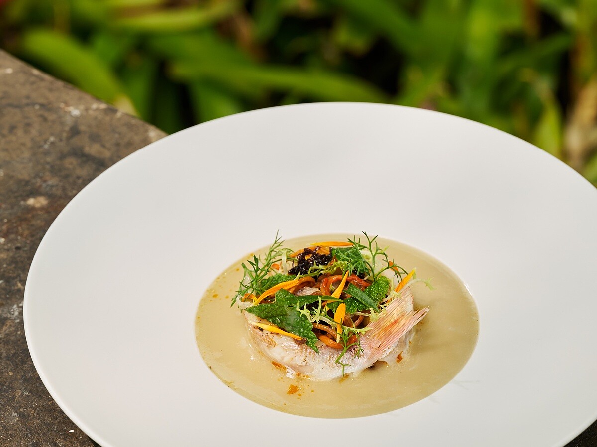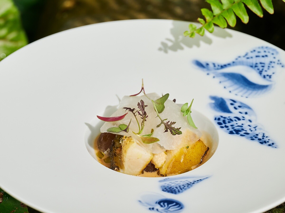 此道料理源自 Chef James 童年時的日常記憶。學生時期放學後,母親總會準備一份便當,以糙米飯搭配魚肉與自製 XO 醬,成為他對「家常味」最直接的印象。這次他將這段記憶轉化為一道更細膩的當代料理。 選用肉質細緻的新鮮魚種,經去骨去刺後清蒸,保留食材本身的純粹風味;魚肉內填入綜合菇類,包括草菇、竹笙與蟲草花,帶出柔軟與彈潤交織的口感。醬汁則延伸自糙米的概念,將糙米熬煮並打製成滑順濃郁的「無米粥」醬,提供溫潤綿長的基底風味。 XO 醬作為另一個關鍵元素,改以金針菇取代干貝,並加入油封後爆炒的蟲草花,堆疊出鮮香濃縮的層次。最後點綴莊園自種香草,如檸檬馬鞭草、香蜂草等,為整體帶入清新的柑橘氣息,使這道料理在濃郁與清爽之間取得平衡。菜名「XOXO」除了呼應 XO 醬,也隱含對母親記憶的回應。