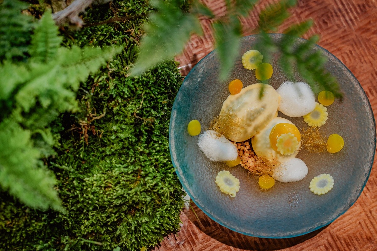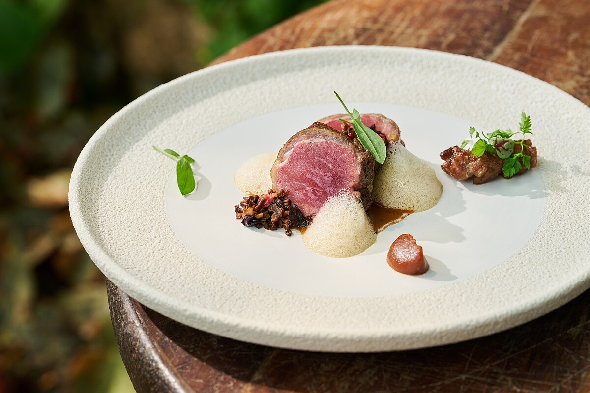莊園內園藝團隊為「黎森」打造近70平方米的菜園,一季種植30餘種作物,芳香萬壽菊、鳳梨鼠尾草、香蜂草、金桔、佛手柑直接供餐廳入菜,也用來製作當季草本茶。而主廚邱一中本身是客家人,三義又是臺灣重要的客庄之一,客家料理講究醃漬、發酵與乾燥的保存工法,這些技術被他直接帶進菜單,讓精緻西餐的框架裡藏著在地的飲食記憶。