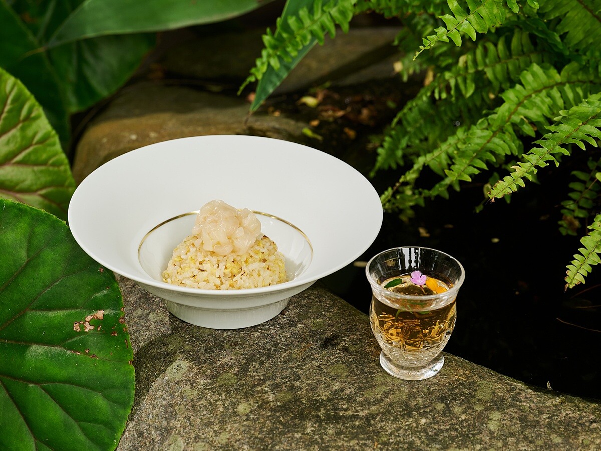 為「Wok by O'BOND」的招牌菜,以傳統揚州炒飯為靈感,重新收斂其風味結構。主廚先將蝦仁、青豆與菇類等食材熬製成高湯,並以此浸泡、炊煮臺東越光米,讓每一粒米在下鍋前便吸收完整鮮味。炒製後的米飯外觀維持白淨,卻蘊含濃縮風味,呈現出更純粹的表現。配料選用白木耳、當季綠竹筍與雞蛋等較為清淡的元素,並以蔥油爆炒取代蔥段,讓香氣融入米粒之中。上方點綴富山生食級甜白蝦,藉由米飯餘溫緩慢加熱,帶出細緻甜味與柔嫩口感。一旁佐上莊園香草茶,發揮如 sorbet 般的清口作用,使這道炒飯不只是主菜收尾,也能銜接甜點。