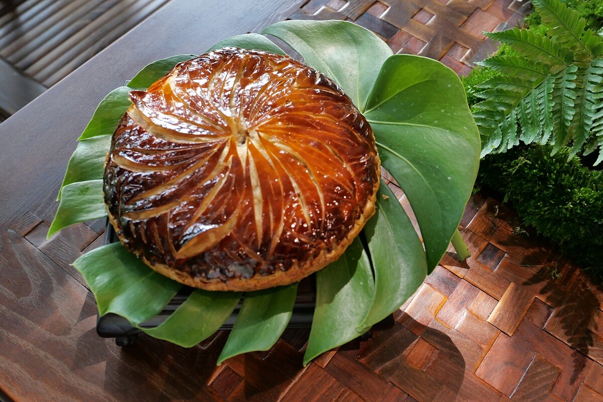 「媽祖派」源自主廚在大甲成長的記憶,結合法國經典國王派的形式重新詮釋。以大甲在地芋頭與「裕珍馨」奶油酥餅為發想,內餡填入以豬油拌炒的芋泥,中央加入豆漿麻糬,再覆上一層芋泥,讓口感在綿密與彈性之間交錯。