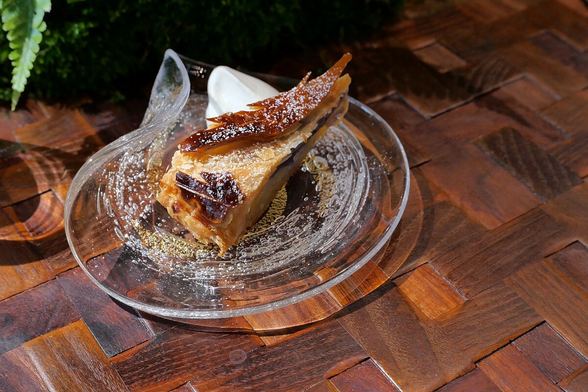 搭配檀木風味的香緹鮮奶油,帶出淡淡木質氣息,呼應廟宇香火的感官記憶,使整體不只是甜點呈現,也連結地方風土與信仰文化。