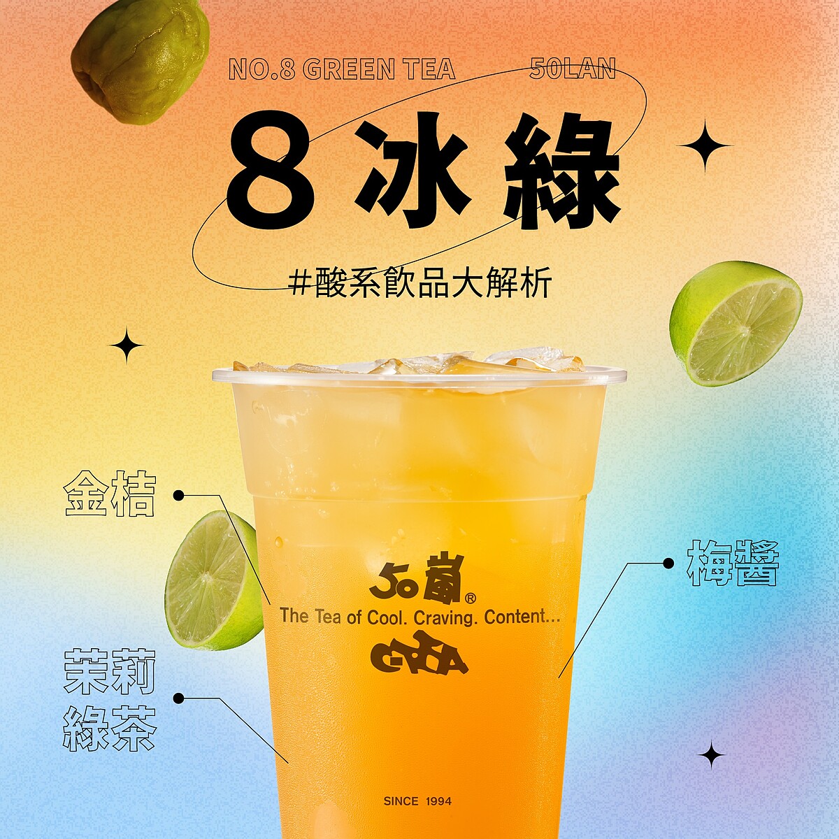 8冰綠口感清爽通透,金桔的酸香、脆梅的鹹甜與綠茶的微澀層層交織,喝起來像初戀般酸酸甜甜。在2026年一片濃郁系奶茶之中,憑藉這股極致清新感成功脫穎而出。