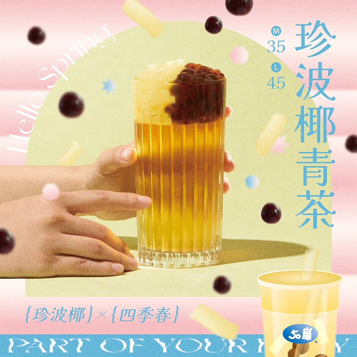 作為50嵐最具代表性的「1號」,以招牌四季春青茶為基底,加上珍珠、波霸、椰果三種配料,清爽解膩的茶香搭上香甜有嚼勁的配料,完美體現了台灣手搖的咀嚼文化
