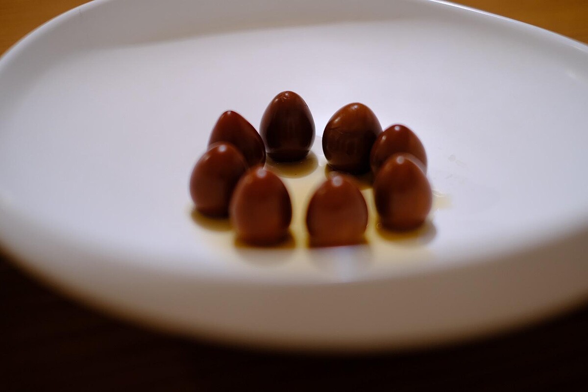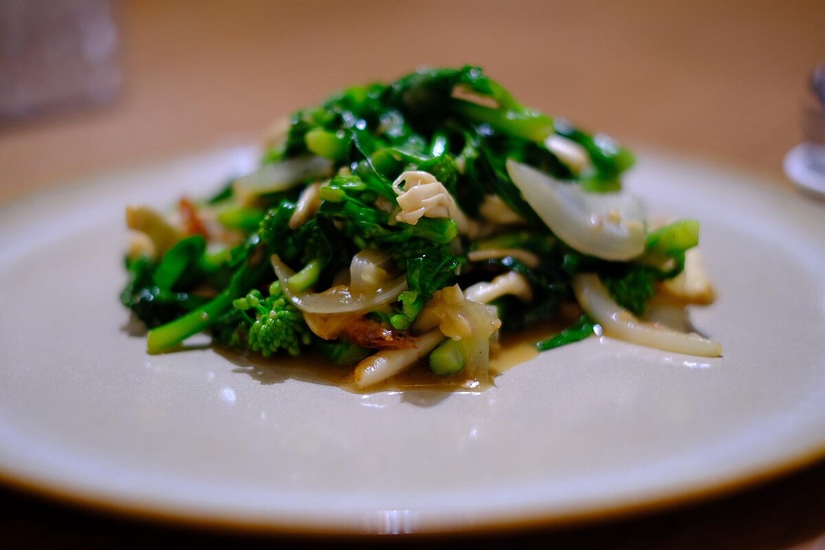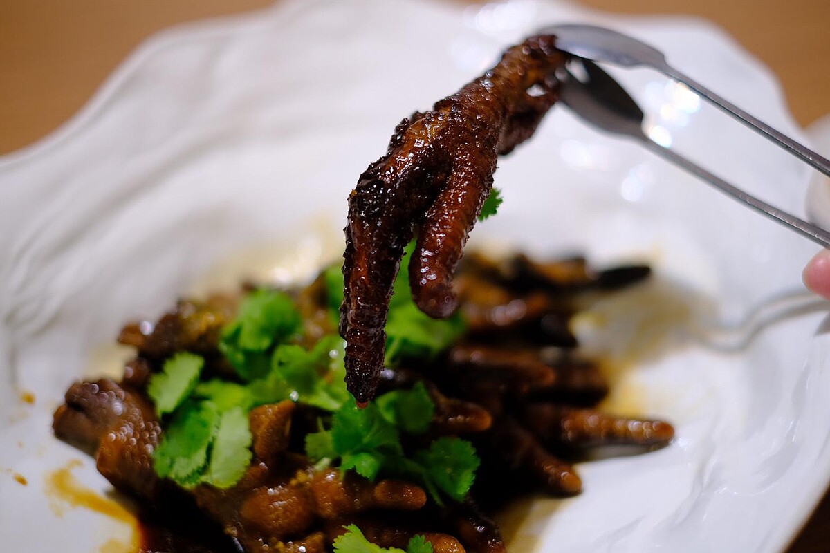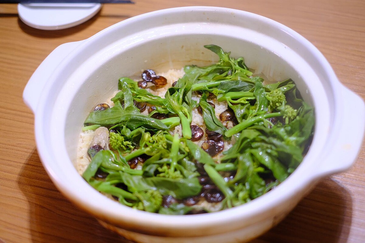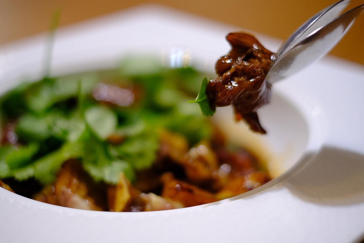 春季新菜從「六味小菜」開始,煙燻花生帶著淡淡木質香,招牌炭烤滷味選用究好豬的豬耳朵、豬頭皮與雞腳,川燙後炸至表皮焦脆,再經炭火收香,微微焦氣令人著迷。發酵蘑菇小九孔以輕盈酸度帶出海味;椒麻玉米用水果玉米炭烤後淋上椒麻醬,辛香開胃;紅玉鵪鶉蛋以紅茶煙燻,釋放淡淡茶韻;百香海蜇皮則以清爽果酸收尾。六道小品各自獨立又彼此呼應,為整套菜單緩緩拉開味覺序幕。