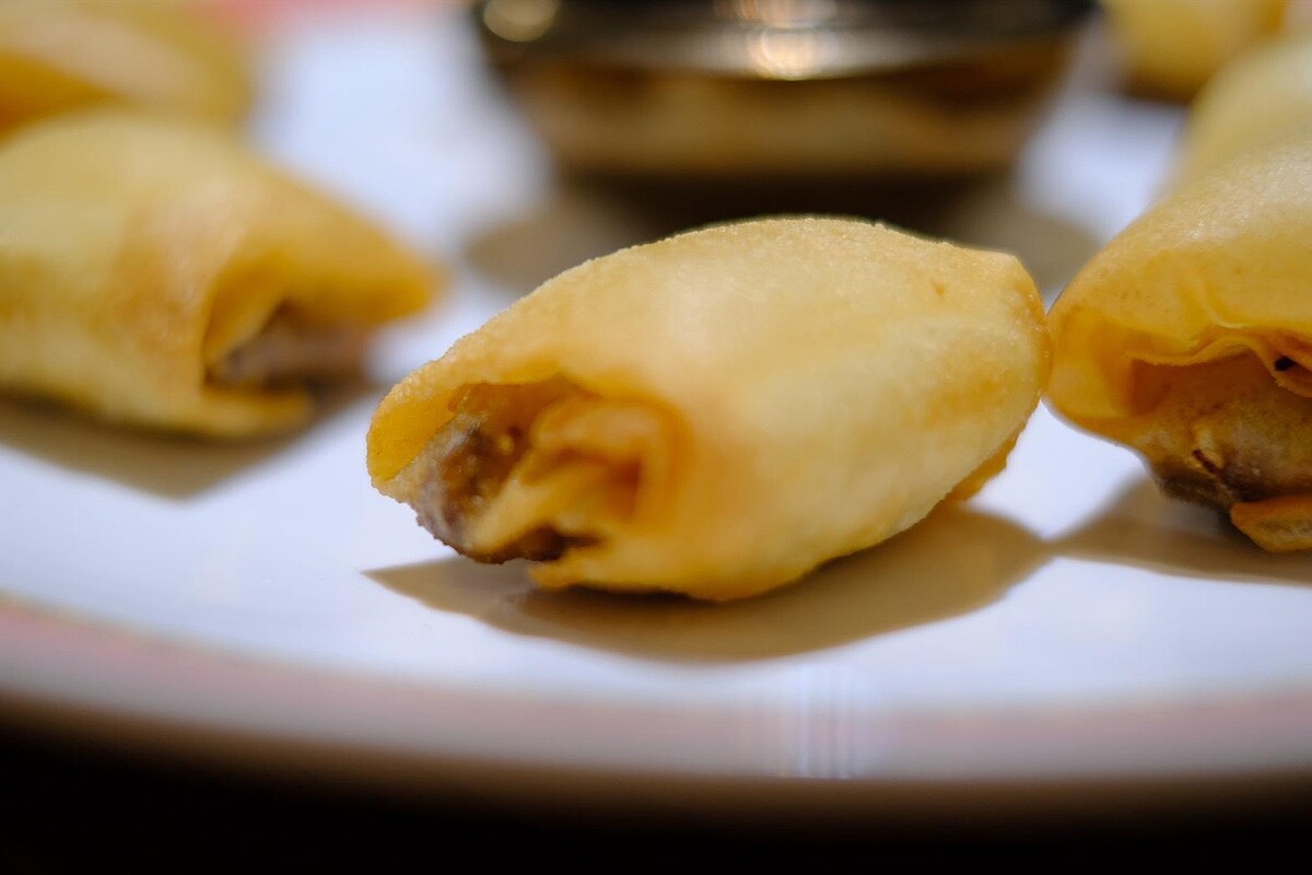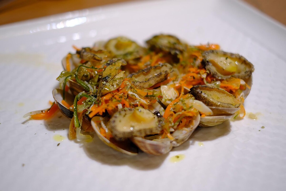 接著登場的「蛤蜊拌鮑魚撈起」將蛤蜊清甜與鮑魚彈韌完美交織,爽口開胃;「煙燻鮭魚卵乳酪起司沙拉」用煙燻乳酪與酸奶醬襯托北海道鮭魚卵的鮮甜,檸檬汁點綴後更顯明亮。溫熱菜式中,「究好豬控肉炸春卷」外酥內潤,控肉膠質與油脂交織,口感豐富;「蒜子橄欖油燒海螺鮮魚」則展現主廚對火候的精準掌控,蒜香與橄欖油果香包裹海味,山菜過貓增添清脆,傳統與創新和諧共存。