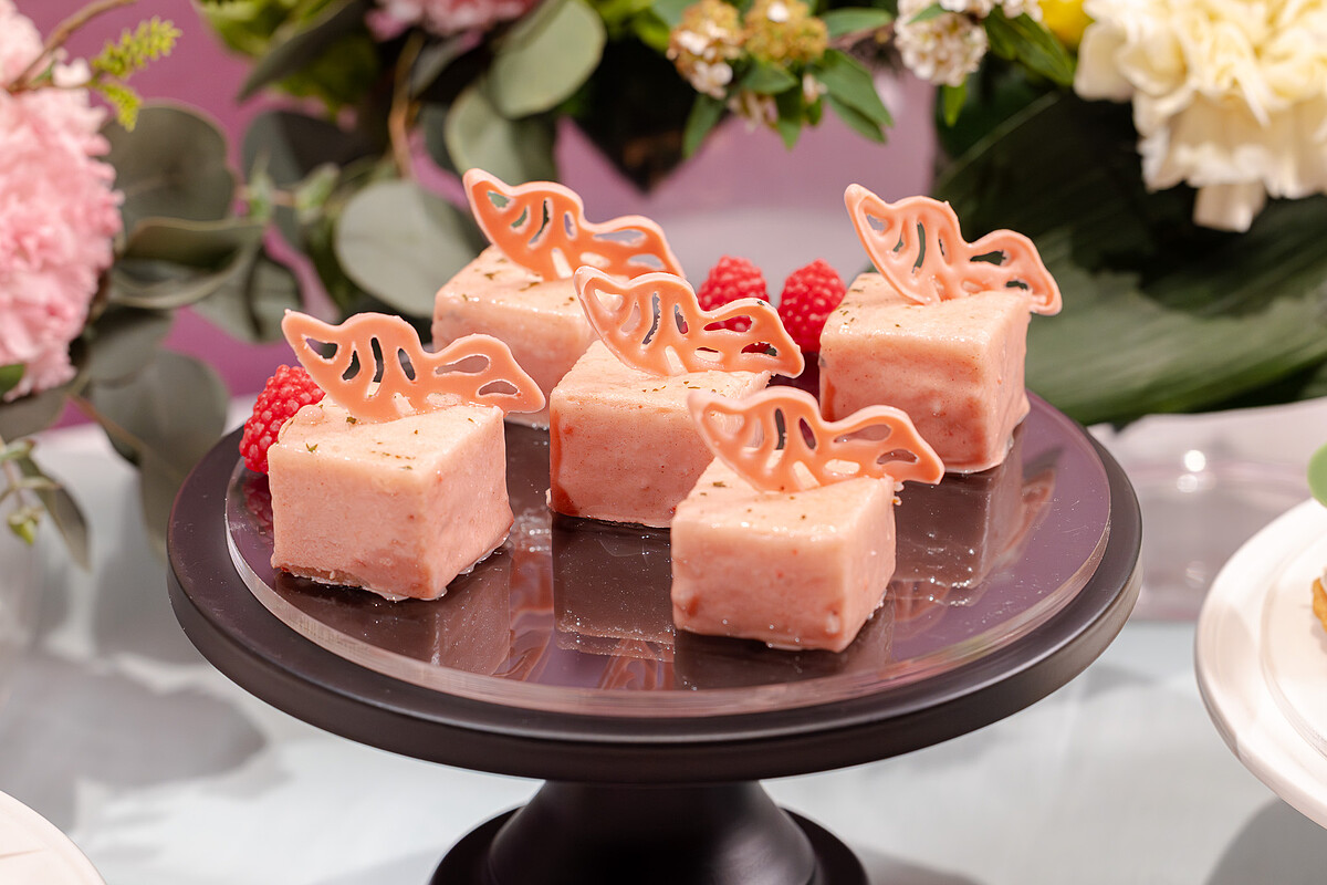 另外「羽瞬(綿雲莓果塔)」以草莓果泥製成如綿雲般入口即化的空氣果凍,裹上莓果白巧克力,交織出細緻酥脆的口感,「露雫(百香覆盆莓塔)」則以酸香明亮的百香果奶油餡,搭配輕盈柔滑的覆盆莓蛋白霜,包覆於酥脆塔殼之中。