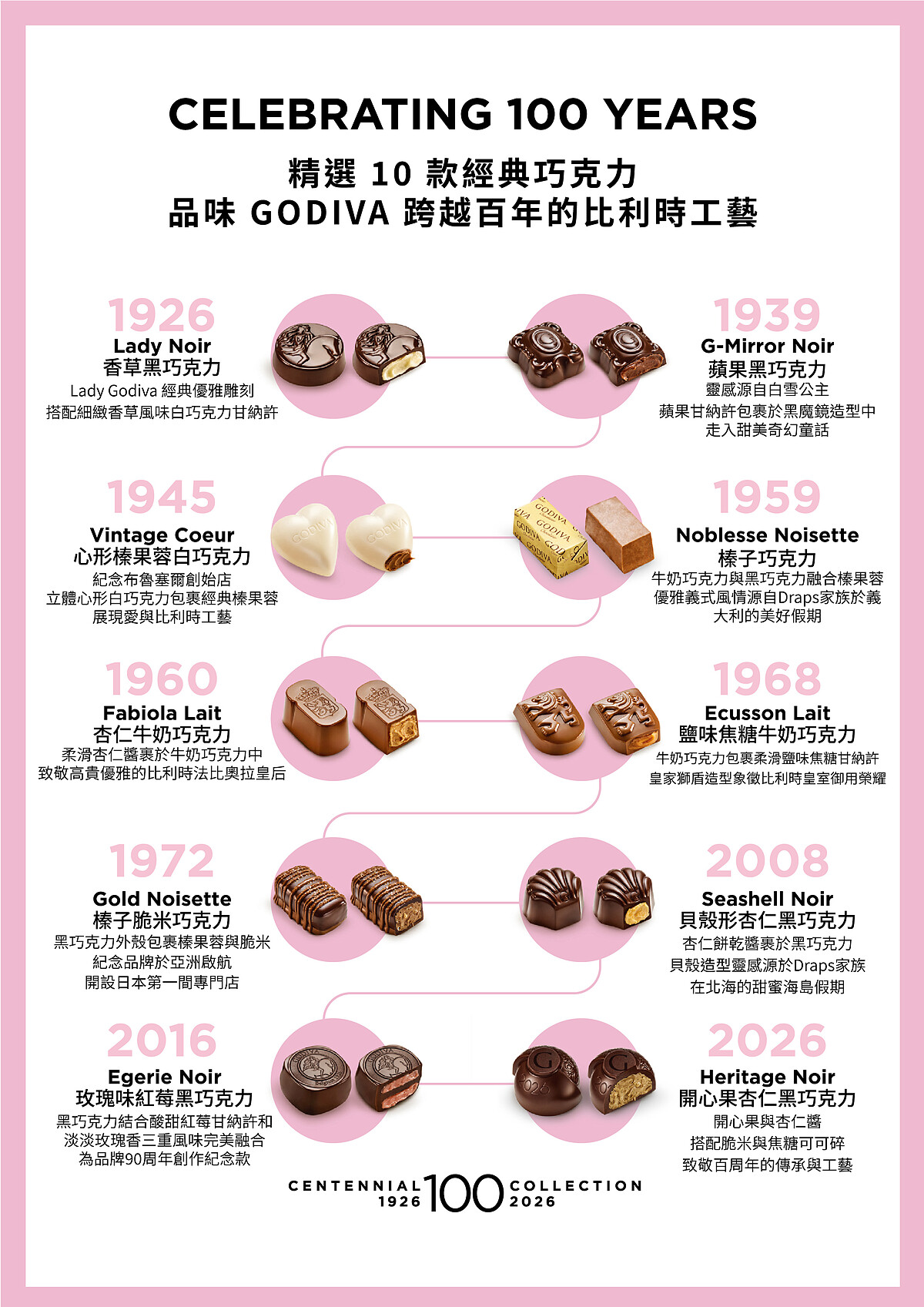 禮盒共收錄10款作品,其中9款來自 GODIVA 不同年代的代表作,另1款則是專為2026年百周年打造的「2026開心果杏仁黑巧克力」。從1926年的Lady Noir到2016年的Egerie Noir,每一款都承載著品牌不同時期的工藝與靈感,讓這份禮盒兼具品嚐與收藏價值。