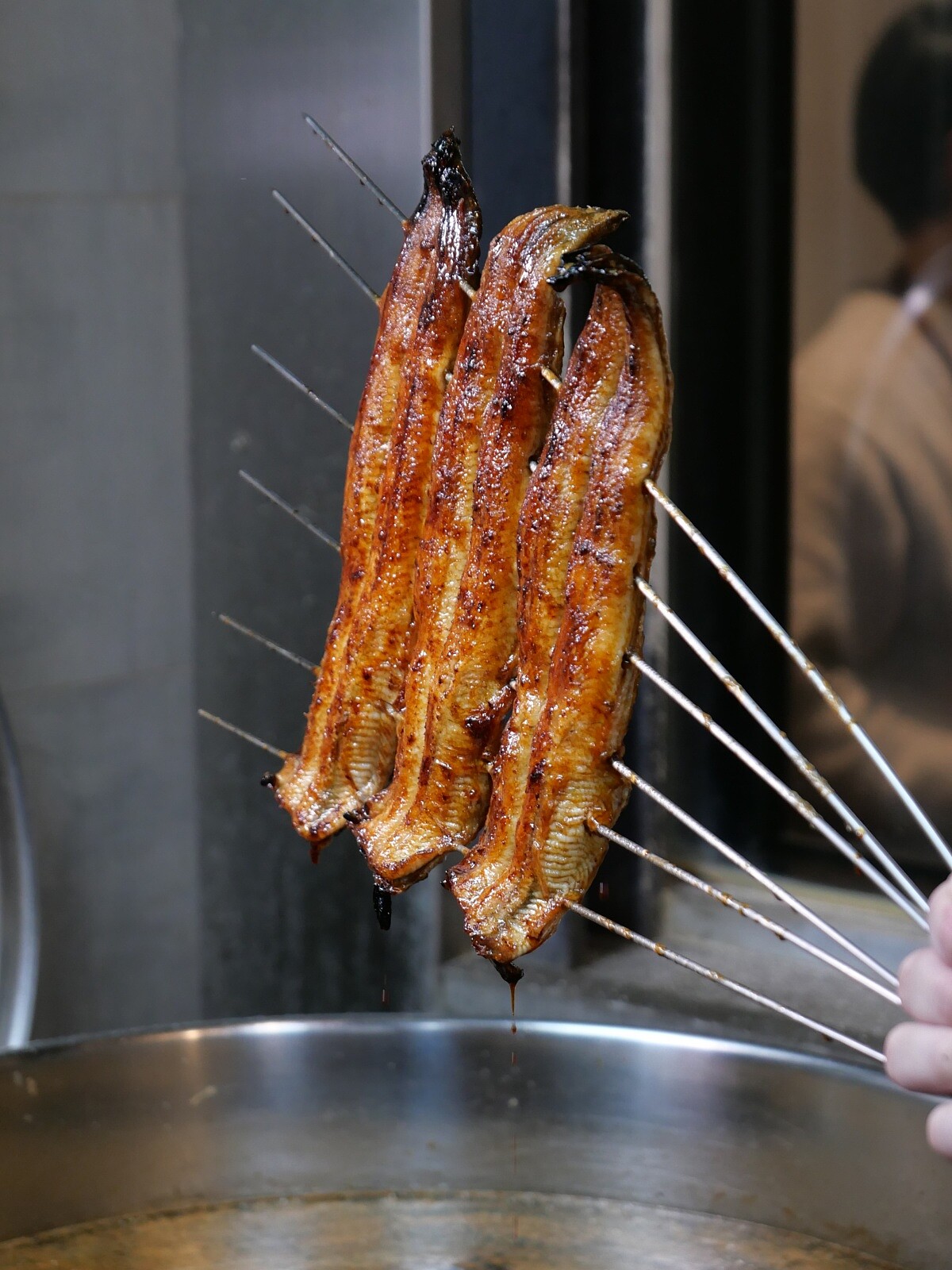 烤臺的培訓期更加困難,最短至少要三個月。餐廳採用炭烤日式直火工法,外脆內嫩的口感不是靠機器標準化,得靠師傅的手感與眼力慢慢累積出來。每尾鰻魚在烤製前先串燒定型,炭火逼出皮下油脂,最後浸入秘傳醬汁,工序環環相扣,差一步都難以到位。