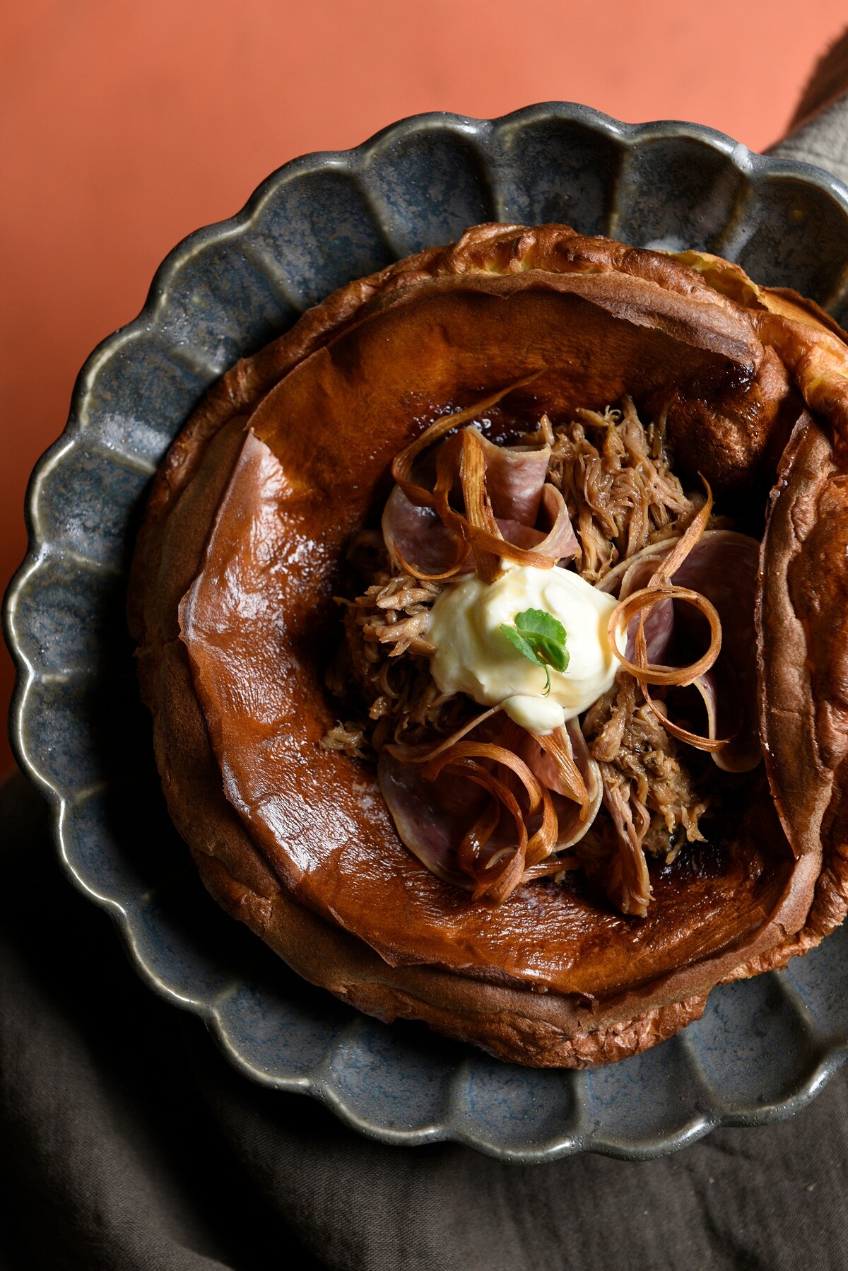 餐廳的招牌菜色為「倉餅」,自開幕就沒離開過菜單。這是由 John 與合夥人娃娃一起反覆測試出來的菜色。先從鐵鍋鬆餅出發,最初版本口感酥脆,就連底部也是,但兩人又覺得應該要有「軟」的口感,才能讓餅吃來有層次。於是開始一批一批調整,牛奶與麵糊的比例不斷修正,調到兩個人都點頭才算定案。最終版本的「倉餅」,外層有一層薄脆的焦糖香氣,中間Q彈,咬下去有層次,適合搭配各種餡料。可以選擇煙燻鮭魚、火腿慕斯、手撕豬肉等口味,本季再加入賣相當豐盛的「慢烤牛小排倉餅」。