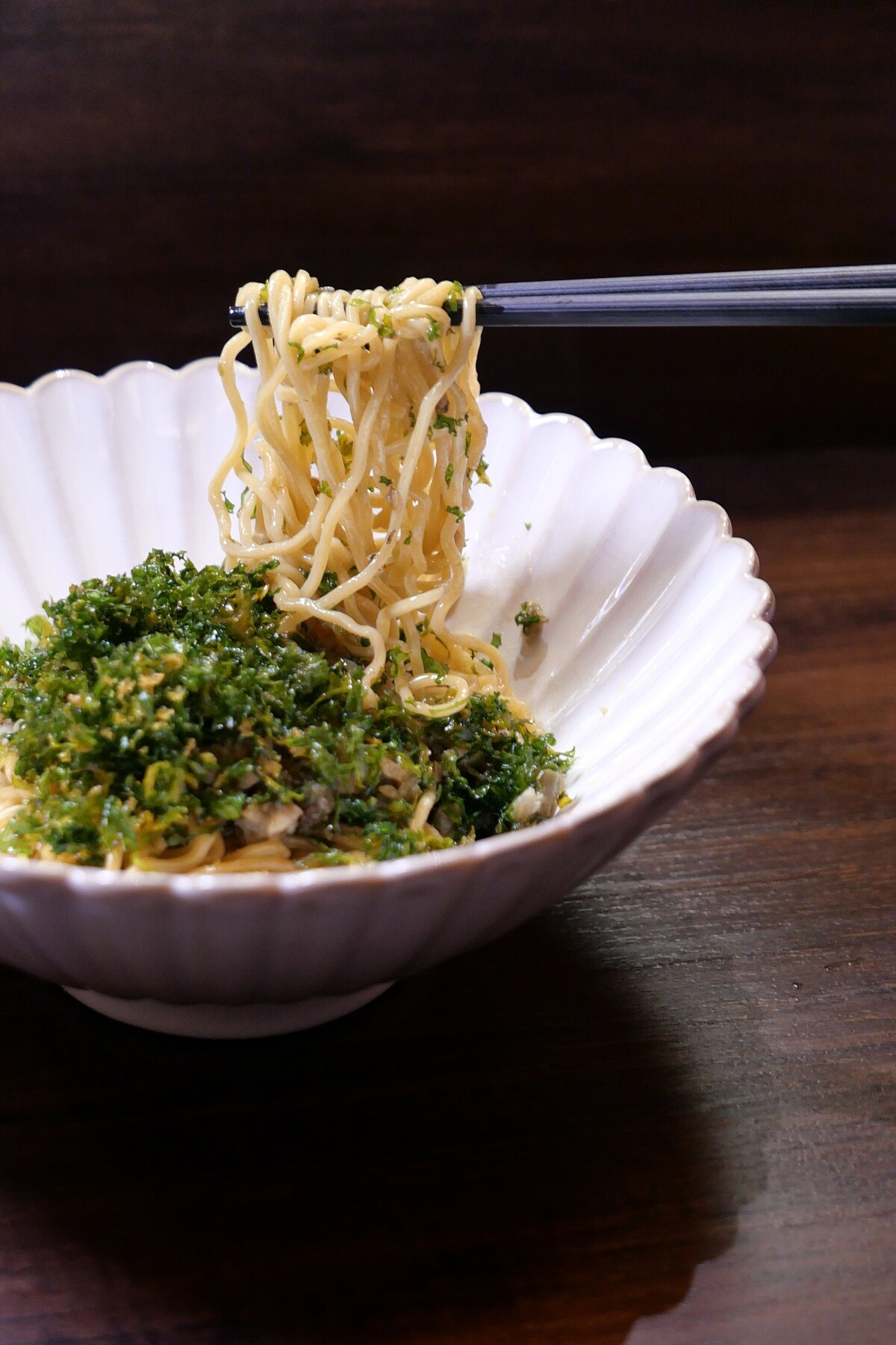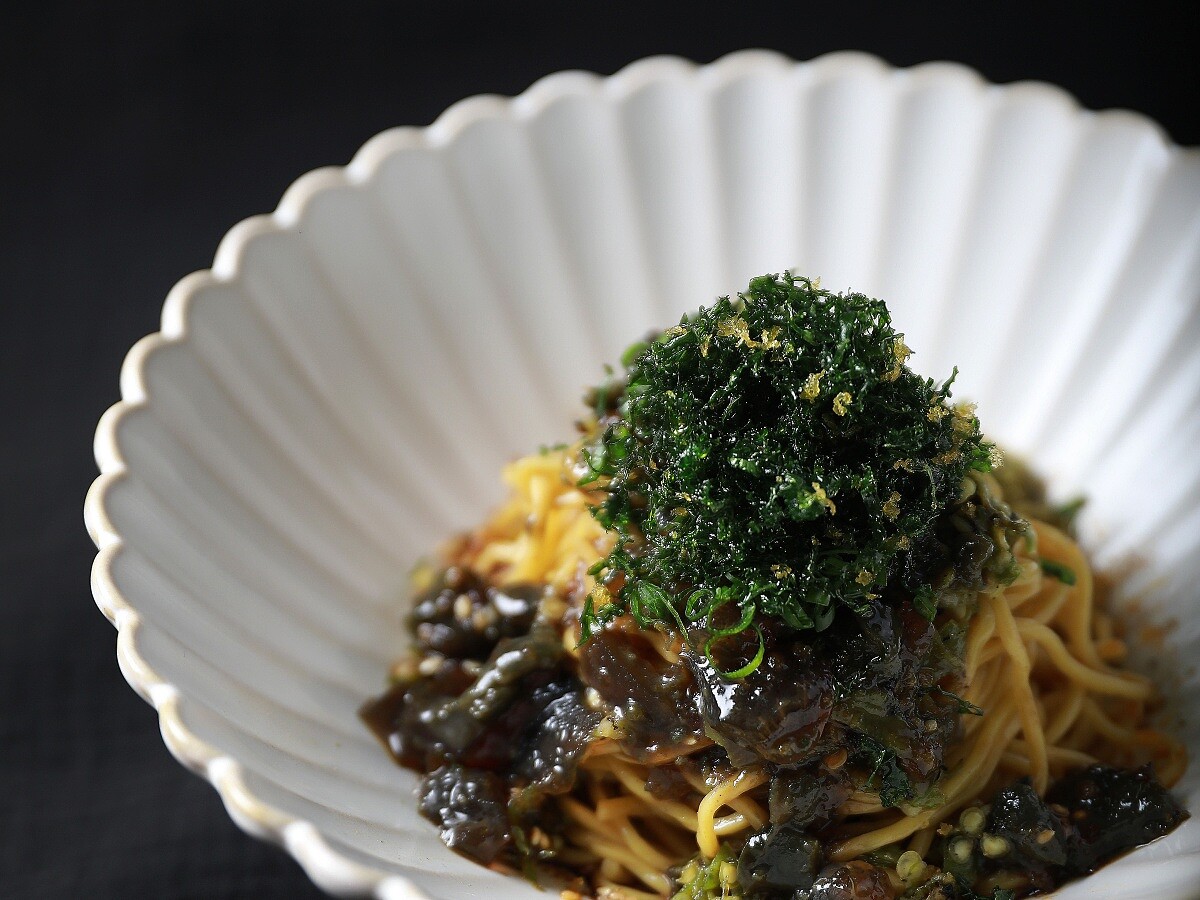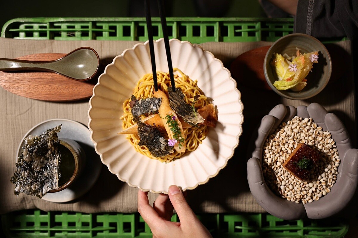 開店至今的招牌品項,滿滿酥香的羽衣甘藍與烏魚子底下,是皮蛋醬、糯米椒燒椒醬交織而成的風味,尤其加入中藥香料油、重慶撈汁醬的風味點綴,讓皮蛋麵成為一道上癮麵作。( NT140)