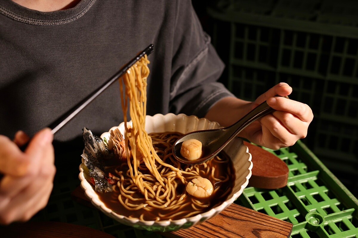 由台灣蝦捲延伸而來的蝦捲乾拌麵,以帶來手作蝦捲為主角,並以紅油撈汁與蝦油勾勒出立體風味,從麵條到蝦捲都能感受得到鮮蝦的濃郁鮮甜。 乾麵類可加價130元組成套餐,搭配「山東蔥餅佐焦糖雞肝慕斯」和「上湯娃娃菜」共兩款小菜,以及選用澎湖海菜和現刨台東鰹魚柴魚片捎來海潮氣息的「鰹魚海菜湯」。(蝦捲乾拌麵 NT160元、套餐加購價NT130元)