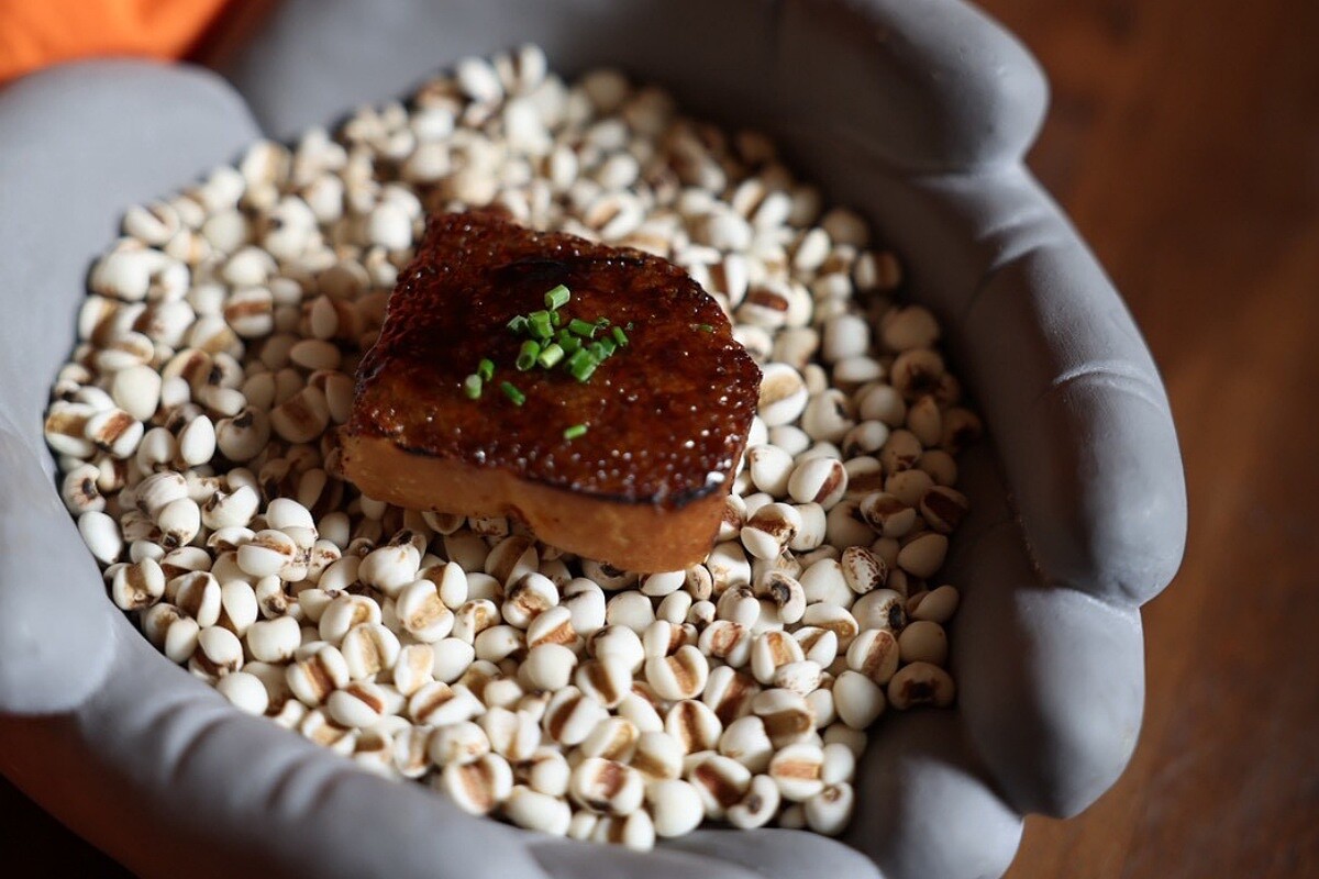 研發主廚家裡附近的早餐店賣的超級好吃山東蔥餅,被移植到倉廩來了!研發主廚John說到「早餐店阿姨自家擀製的蔥餅越嚼越香,與炙燒過帶出焦糖、濃厚肉脂香氣的雞肝慕斯相當絕配。(NT60元)