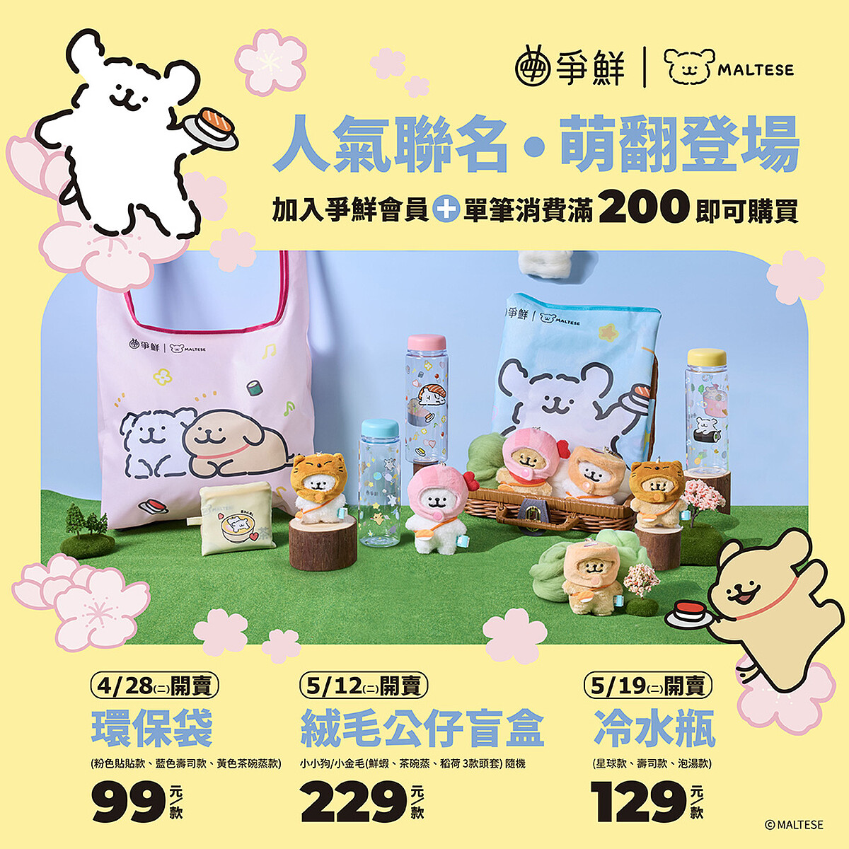 除了餐點,最受矚目的莫過於12款聯名周邊。只要加入爭鮮APP會員,於門市單筆消費滿200元即可享加購資格(可累計)。周邊採分波段開賣,讓粉絲每週都有驚喜:
