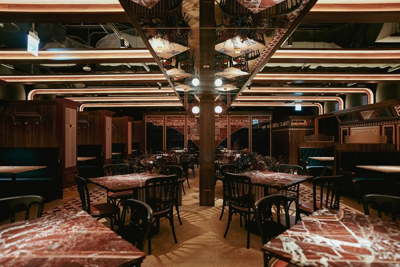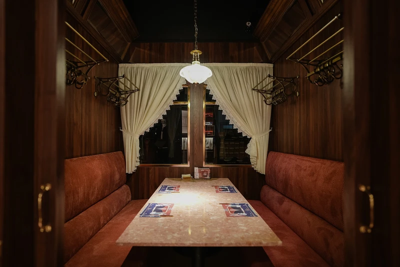 餐廳一間比一間還要美,「輪輪1976-和食茶酒駅」這回也是網美必衝,延續品牌西門町本舖的經典火車意象,以星級東方快車之姿登場。迎賓吧檯以火車站票亭設計為靈感,優雅的列車包廂搭配天鵝絨面觸感坐墊,有著和洋摩登風情,店內還陳列純手工製作的微縮火車模型,將火車元素發揮淋漓盡致。