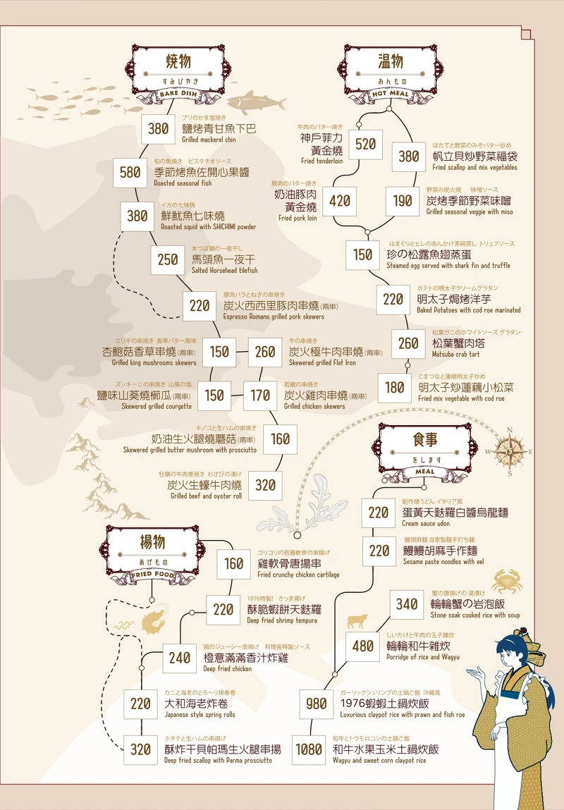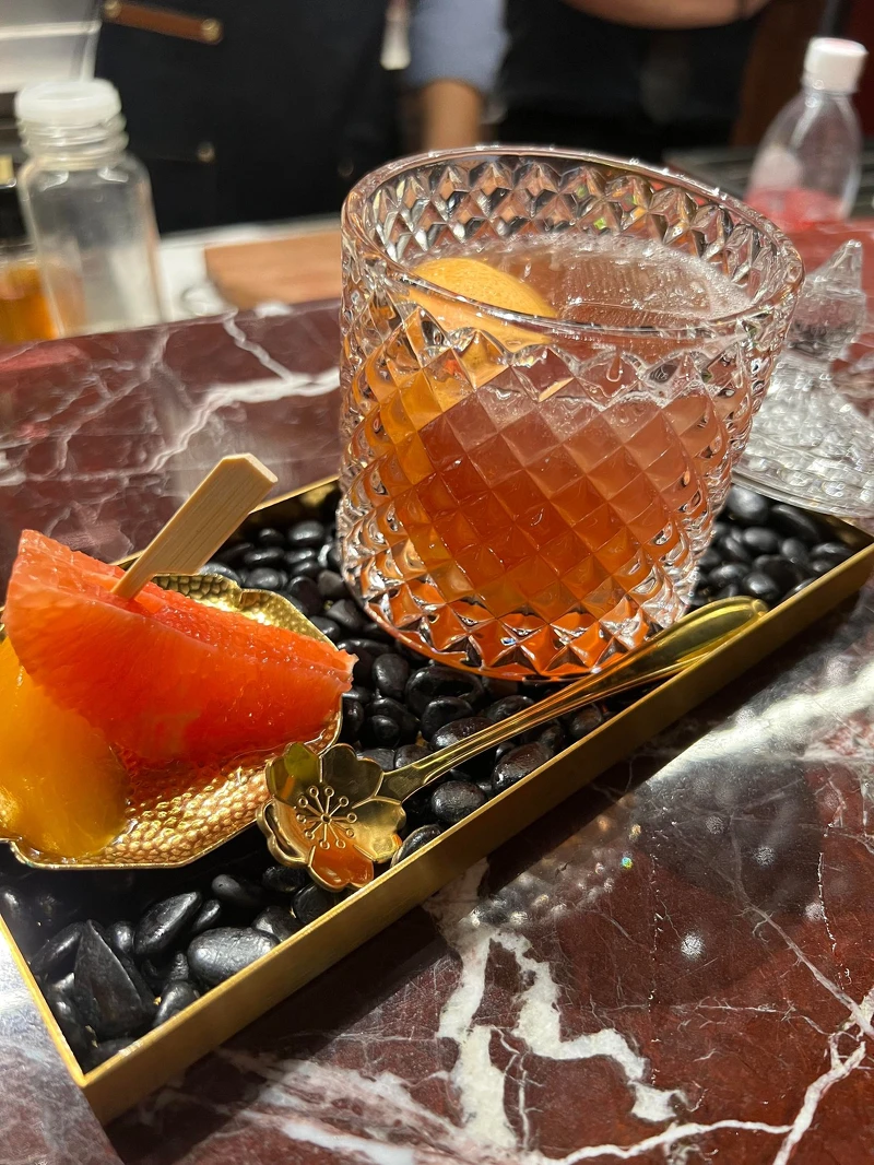 想要微醺一下的人,怎麼能不來杯特色調酒,口味選用日本各地在地特色為靈感發想,其中「日光東照宮」以伏特加為基底,調入桂花、金萱茶的香氣,外觀宛如一杯隱藏在金色寶箱裡的日光東照宮,而「伏見桃山城」甚至加入菸白葡萄酒果凍,並結合葡萄柚與蜜桃類水果,適合喜歡果香類的少女少男,另外還有以酸甜桑椹果漿、甘甜的陳皮梅風味為主體的「墨染寺」,有著清新順口的氣泡口感。