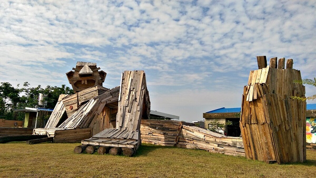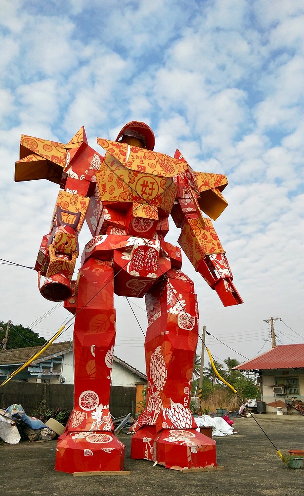 (福祿 Fruit 鐵金剛/劉國滄X打開聯合:由水果紙箱製作組成的鐵金剛,頂天立地守望著阡陌巷弄間的芸芸眾生,Fruit =福祿,意味豐碩的果實,延續地方生生不息。)