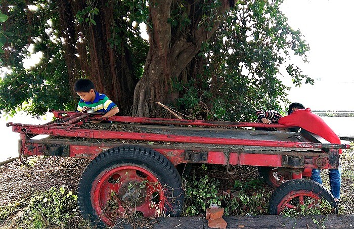 (人也是土溝的風景,不妨跟居民們聊聊天熱情打招呼!這幾個調皮鬼正忙著撿桑葚跟金桔用打火機烤來當點心吃。)