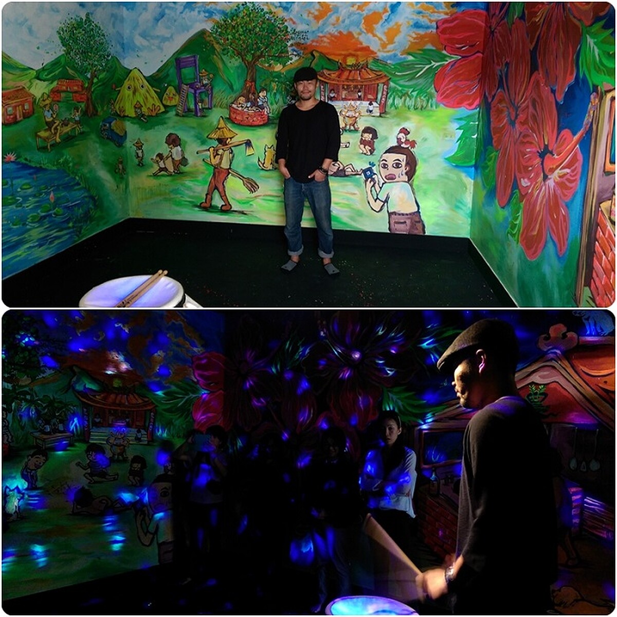 (拾憶/劉主揚X王國仁X優雅農夫音樂工廠:古早時代米缸是家家戶戶不可或缺的物件,如今搖身一變成為鼓,隨著節奏打擊幻化的聲光,重拾農村世界人親土親的回憶。)