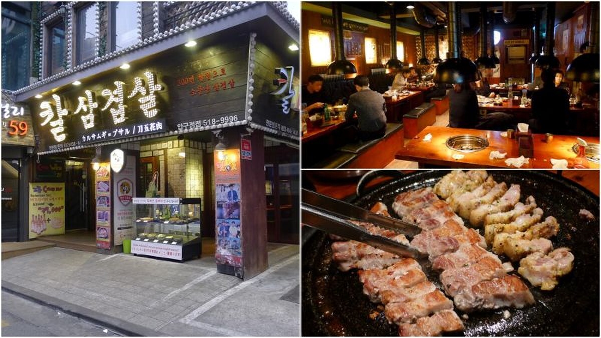 遠遠望見這間幸福秋風嶺刀削三層肉,就覺得這間烤肉店不得了。在稍嫌冷清的狎鷗亭街道中,唯有這間店人聲鼎沸、燈光明豔,外牆還貼滿了超過五十張以上的明星簽名。這裡也是江南上班族們下班後的熱門聚餐店家之一,可以看到不少穿襯衫的長腿上班族歐巴們。平日上班早出晚歸的友人,都忍不住抓著我說:「欸~這裡男生好優!」有帥哥,又能追星,還有美食可吃,這間店自然列入我的首爾美食清單裡。