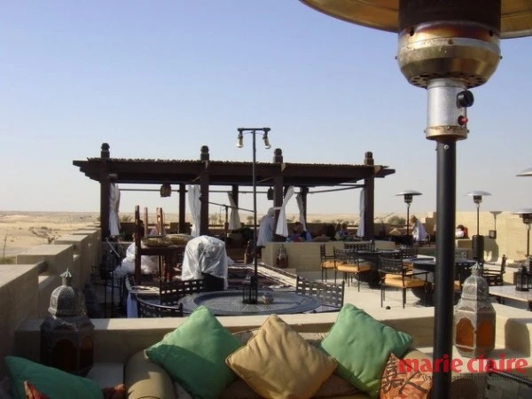 位於五星級酒店沙漠皇宮的頂樓露天平台上,佇立著一座可以望遍整個沙漠美景的酒吧,白天可能顯得炎熱許多,邊上也搭著一些木棚與窗簾可以遮陽,接近傍晚還可以欣賞到沙漠裡的絕美落日景致,說來也是一種新鮮體驗呀!