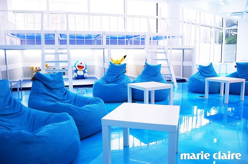 漫畫店也可以如此令人耳目一新,走進店內,天藍色地板上的藍色懶人沙發,就像一座座歇息的小島,可以以各種姿勢坐在上頭看書。更特別的是上方的網子也是座位,邊玩樂邊坐在上頭看漫畫,放鬆又自在;周邊還有一個可以躺在裡頭欣賞落地窗風景的大人球池,初坐時或許會不習慣,坐久後身體也自然的融為一體。