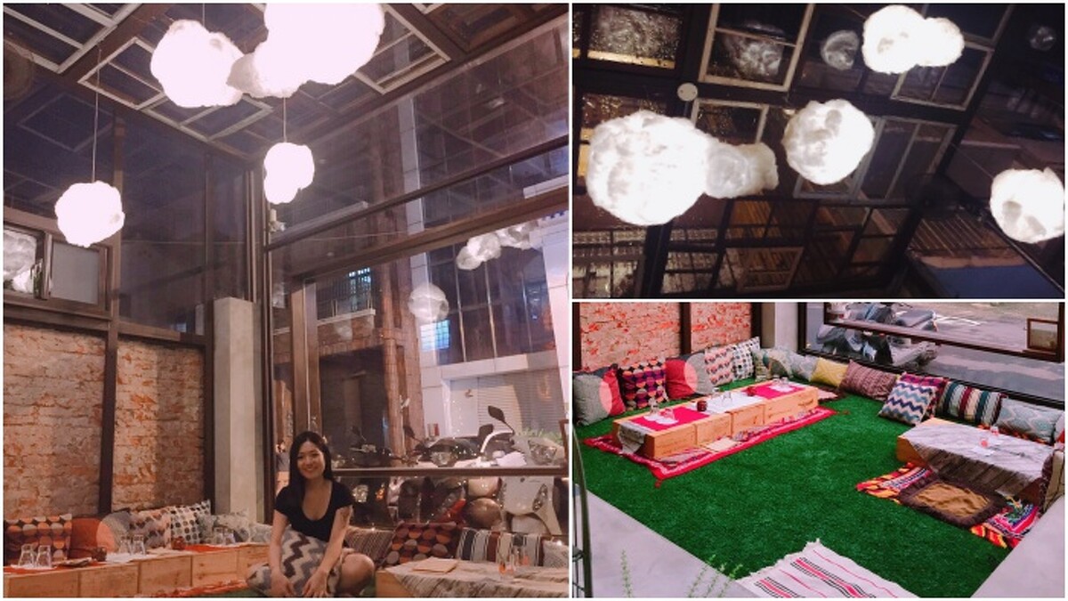 ↓↓ 而原先是屬於戶外的前院也搭建成室內空間,天花板上還有一朵朵白色雲朵,席地而坐的座位區也非常有特色,一定要拍上幾張情境照。