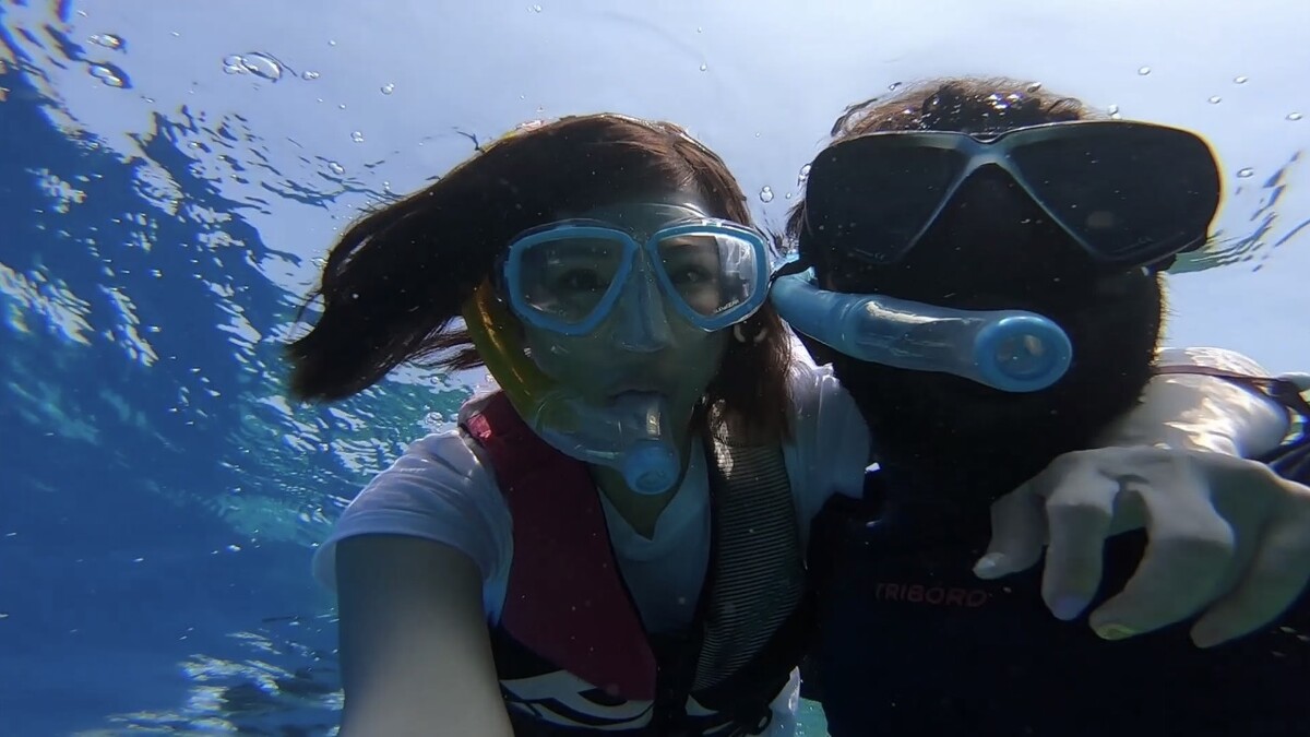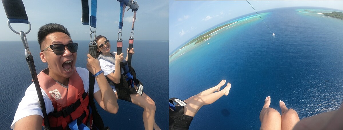 聽過這個傳說嗎?「馬爾地夫再過幾年就要沉了⋯」!當所有人都在跟她說:「來這裡不浮潛就真的白來了!」,這裡的海是如此的湛藍清澈又純淨,鐘欣怡心想:好吧!我都飛來了,說什麼都要給它好好「刺激」玩一回!想玩又愛「該」!最終她決定挑戰“浮潛”及“海上滑翔傘”!現在的欣怡走路很有風,因為她沒想過她可以做到!而且不只做到了!還愛上了!當水上摩托車出發到很遠的深海時,海豚就在身旁不斷的跳躍,真的會感動到哭!整個潛水過程欣怡跟老公是分開行動的!只有教練帶著她一起進入這美妙的海洋。在馬爾地夫的海洋中,有美麗的珊瑚礁及繽紛的熱帶魚,每一幕都讓人眼睛都捨不得閉上~