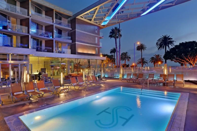 Shore Hotel繽紛摩登的建築造型更讓人眼睛為之一亮,橘色及藍色的搭配,帶來夏天豔陽與海洋氣氛。不管是在房內、游泳池或是戶外酒吧,旅人都能眺望鄰近的聖塔莫尼卡海灘,此區域著名的餐廳、遊樂園與購物天堂也都在步行範圍之內。房客更可以免費向飯店租借腳踏車,讓你的洛杉磯海灘之旅添加一些環保的氛圍。