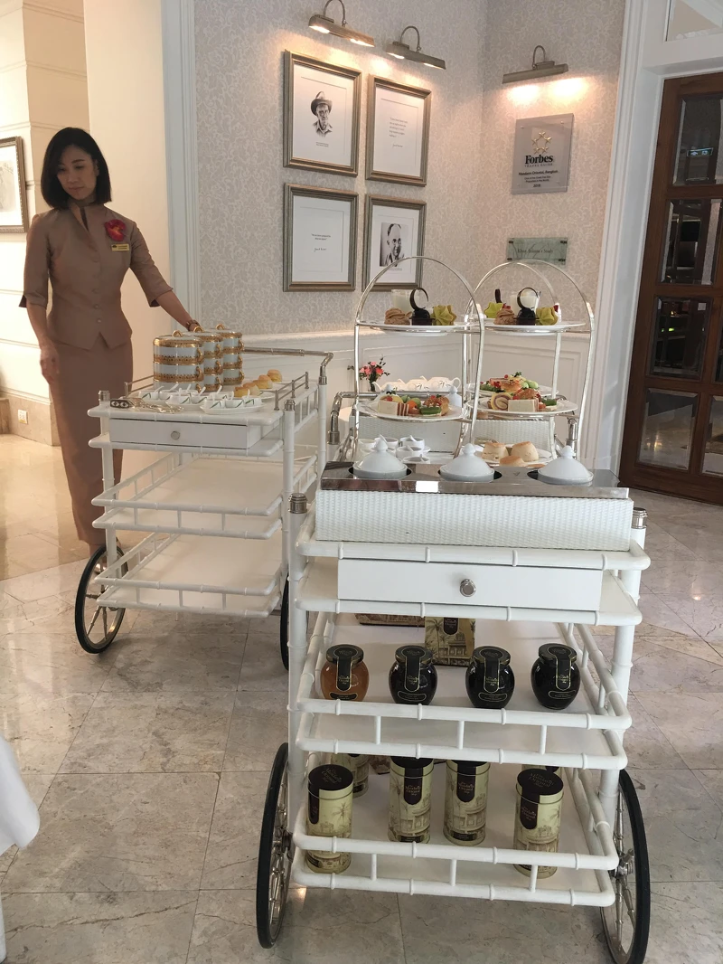用精緻的手繪描金瓷器三層盤,搭配現焙自製英是司康,以竹製純白推車送上,都是僅有文華的傳統泰式風情,幾乎每桌都會點上一套,算是來此的必備款選擇。也有貼心的素食午茶選項。配上TWG茶品,整套午茶價格一人泰銖1450。飯店方很貼心,若兩人前往時,覺得一份午茶量足以供小鳥胃的閨蜜一同享用,第二人也可以點一份最低泰銖390的飲料,即可兩人共享午茶套餐。