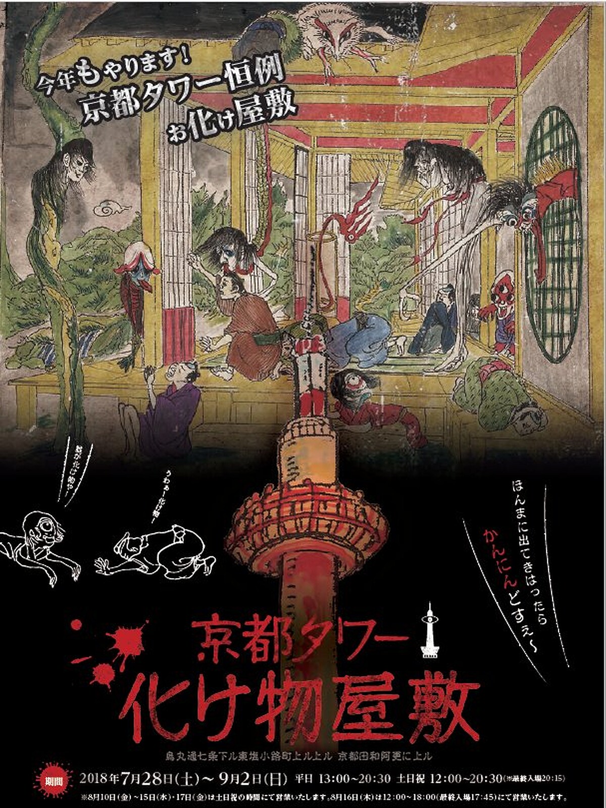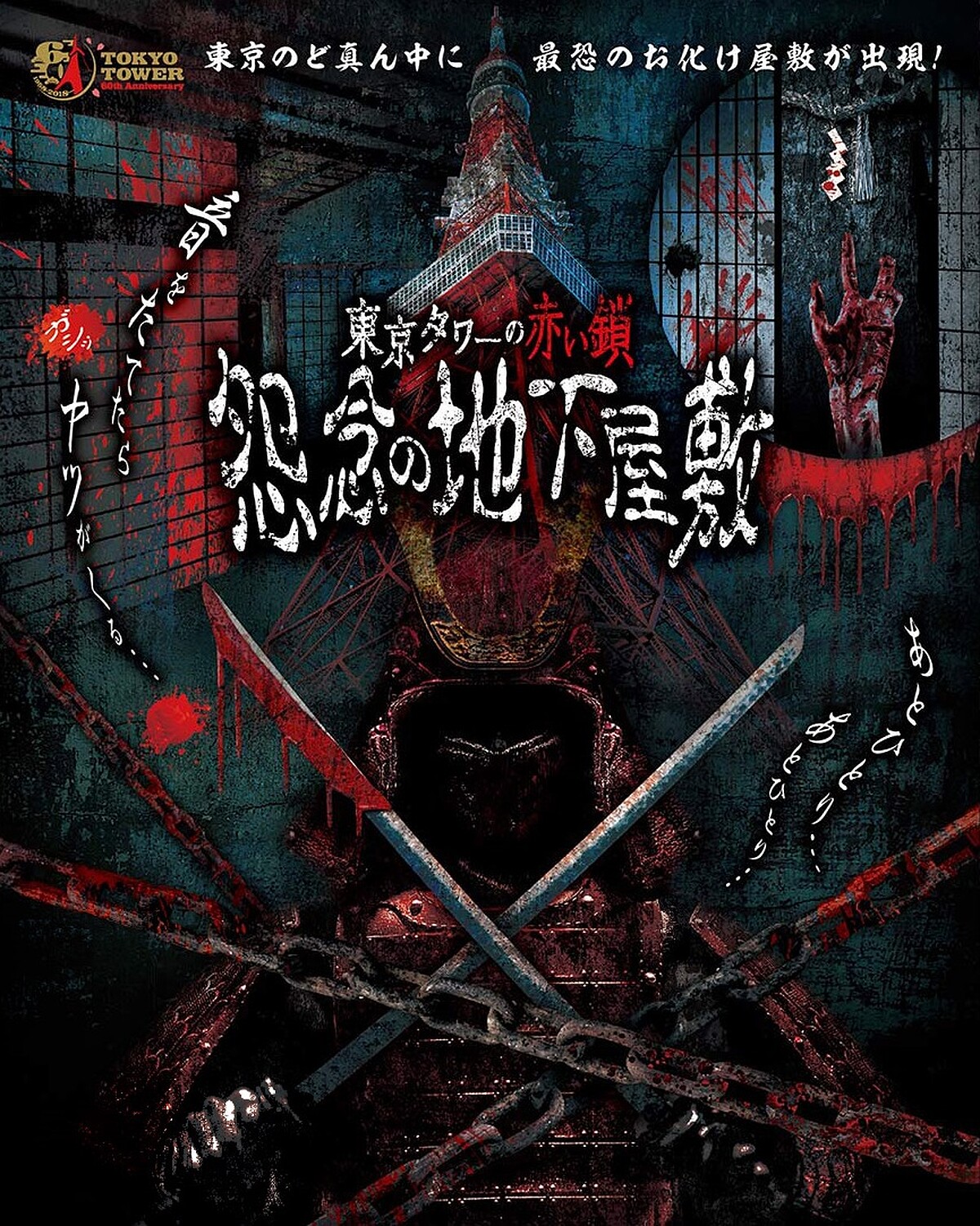 每年夏季,日本各地都會舉行許多試膽大會,讓許多不怕鬼的人前來挑戰,在今年鬼門開前夕,東京鐵塔與京都塔也搶先展開了一年一度的鬼屋活動,各種駭人的主題讓人直直飆升心中的恐懼,而東京鐵塔以「怨念的地下宅邸」為主題,親自步入位於地下一樓的門口,故事描述主角是一名已經砍殺了332個人的武士,並在這個地方氣絕身亡,他的亡靈遊蕩在這地下通道,準備向第333位犧牲者索命(東京鐵塔高度正是333米高),鬼屋裡暗藏許多日本武士刀、盔甲與鎖鏈等,時不時傳來不明的涼風讓人心生膽怯,而步入鬼屋裡的人能否順利脫逃,就靠自己夠不夠膽識了!