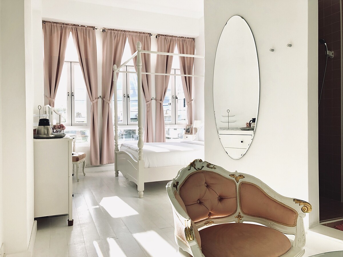 然而,其實這間牛奶糖民宿是男、女主人的第二個孩子,他們在位於恆春鎮上還有一棟「牛奶白民宿」,這裡提供了公主房、簡約房、4人家庭房的選擇,尤其是這間配備公主梳妝台、白色旋轉梯、粉嫩沙發座椅的公主房,真的非常熱門。