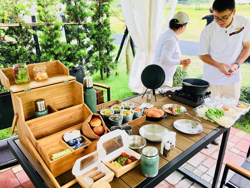 讓人無法抗拒的奢華野營,飯店會提供包括早晚兩餐餐食備餐與管家服務:管家親送晚餐至戶外餐桌,並提供桌邊烹飪:烤牛排、礁溪特產玉田味香腸、野蔬與火鍋餐適合大人小孩一起共享;早餐則會在固定時段,由管家備好特製三層木盒西式套餐至炊事空間供客人享用。
