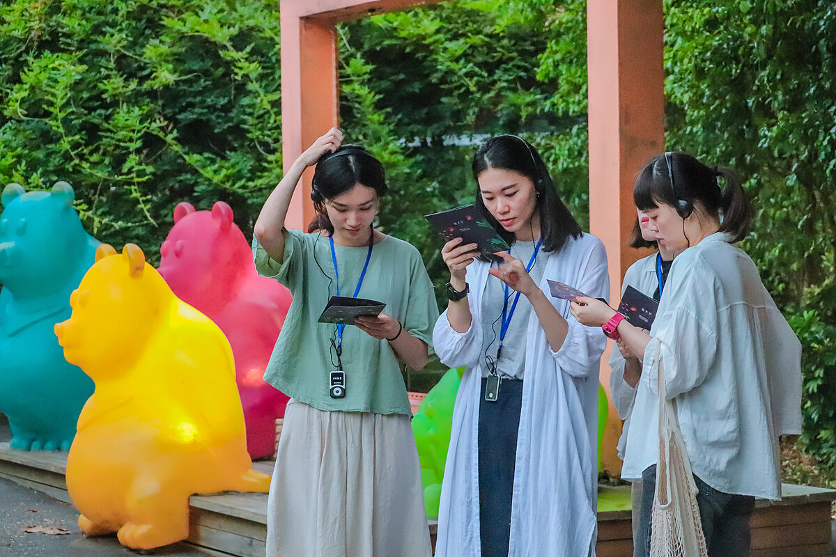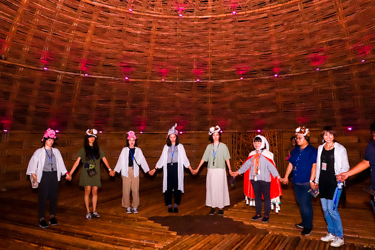每一位入住好夢里的里民,都將在傍晚六點左右抵達。不過來到這裡,你得先褪下日常瑣事,跟著劇場團隊「明日和合」設計的《自造夢》沉浸式劇場,戴上耳機、聆聽敘述者磁性嗓音引導、召喚內心沈睡的夢想與童趣、與身邊的人們近距離互動。演出長度約莫一小時的《自造夢》,將帶你從香格里拉樂園入口一路前行,途中你會戴上可愛的動物頭飾、穿過捕夢網,跟著兔子村長的腳步漫步樹林小徑、手牽手踏進藝術家王文志製作的竹編屋《情天幕》,最後再緩緩步入如夢似幻的「好夢里」聚落。