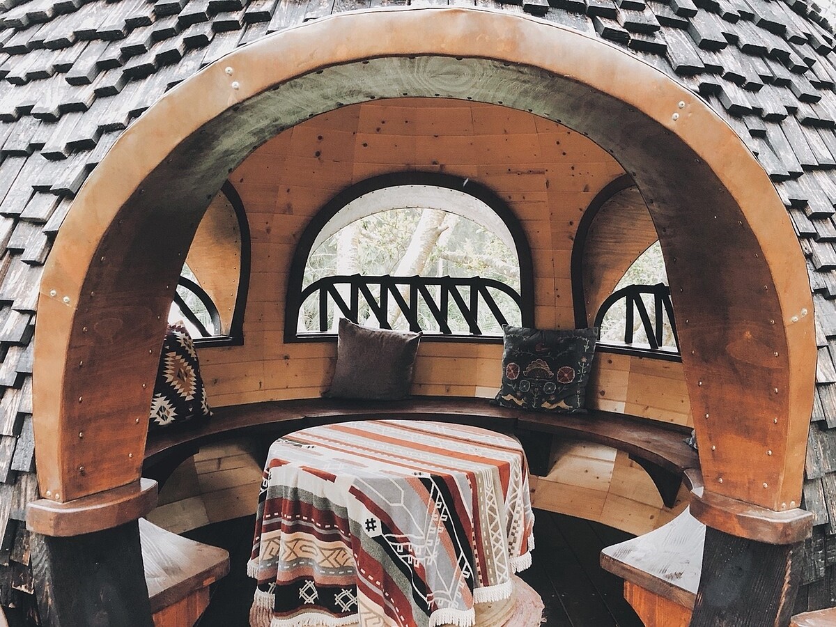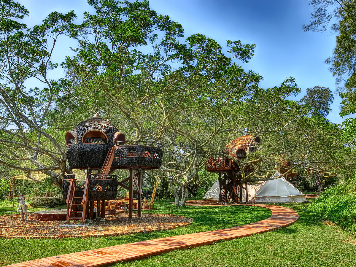 隔天一早,被陽光鳥鳴喚醒的你,可以選擇涼爽樹蔭,與家人好友共進晨光野餐;你也可以在知名建築師、實踐大學建築系系主任蕭有志設計的三座樹屋「獵人碉堡」、「天空書屋」、「聲之屋」之間來趟森林冒險!以種子飽滿形象作為設計主軸,這三座樹屋不僅運用台灣原生柳杉建造,也透過碳化技法讓外表更富層次,吻合建築師提倡的「大量交織」概念。此外,在建造樹屋之前,建築團隊還預先使用「環型掃描」建構周遭環境,以「不傷害樹木」為前提的工法、在上頭另建樹屋,完美展現建築師與勤美學注重環境生態的美好初心。