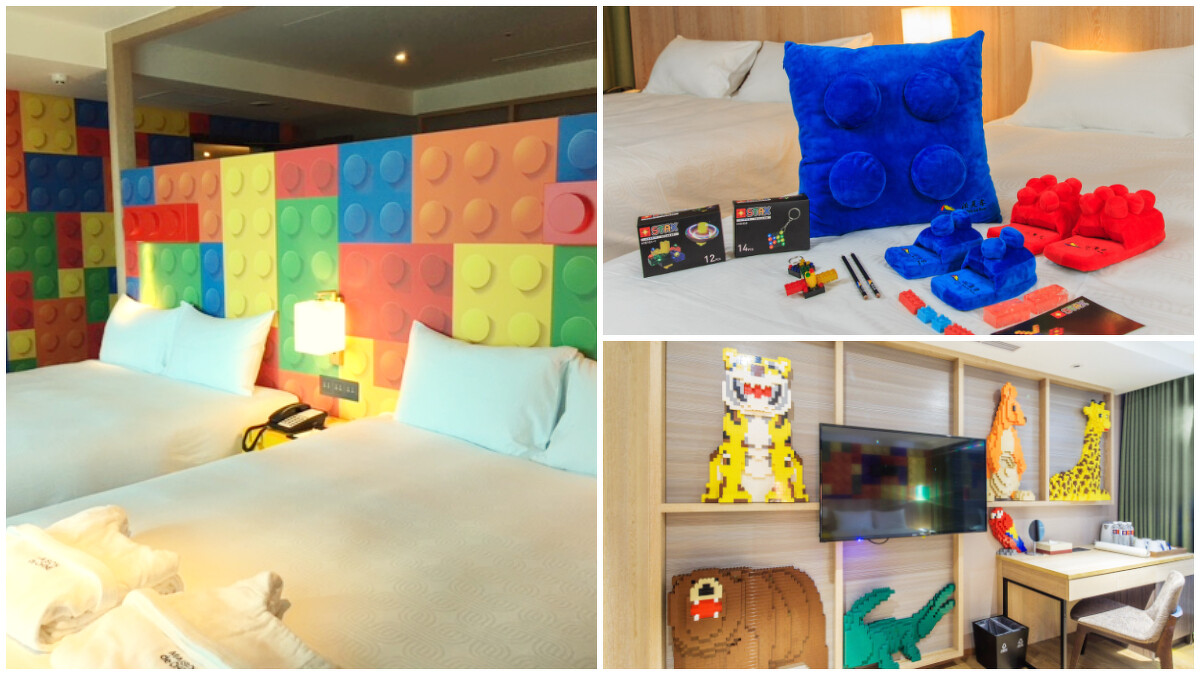 專屬主題客房樓層,除了電梯間有繽紛的立體積木球牆可供拍照外,僅限11間的獨特積木主題客房內,有以萬千積木堆疊出諾亞方舟故事中的多種森林動物積木3D立體裝置、床頭櫃更設計為放大版積木造型,床板上方牆面除了有積木色圖案,虛實之間還搭配藏有閱讀燈的積木立體木作。