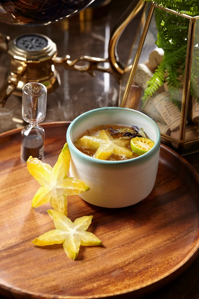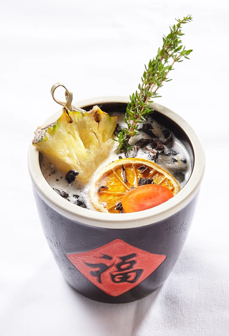 用台灣特色水果命題:芭樂、楊桃、番茄和鳳梨。Bartender小龍把烏龍茶結合紹興酒,只取兩款香氣,紹興有著醬油與雪莉氣味,搭配鳳梨和番茄,用果味中帶著酸鹹的口感作為茶和酒的橋樑。小心思則是裝在貼有福字的迷你釀酒缸造型杯。