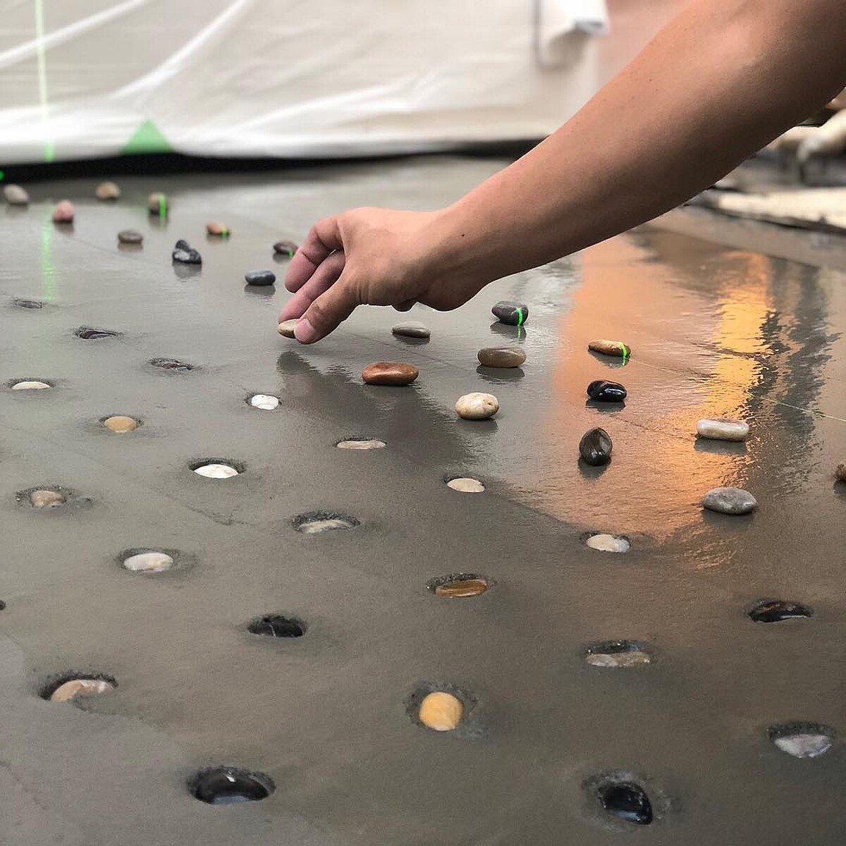 蜷尾家東京概念店以日本古早味糯米丸子店和茶屋氛圍為藍圖。為了表現冰淇淋纖細的質感,牆面和櫃檯使用灰泥(熟石膏)塗料,並作曲面加工,打造出如冰淇淋般印象的空間。地板上則鋪寓意各種食材的繽紛玉石。另外,天花板和磨石地都有暗藏LOGO。