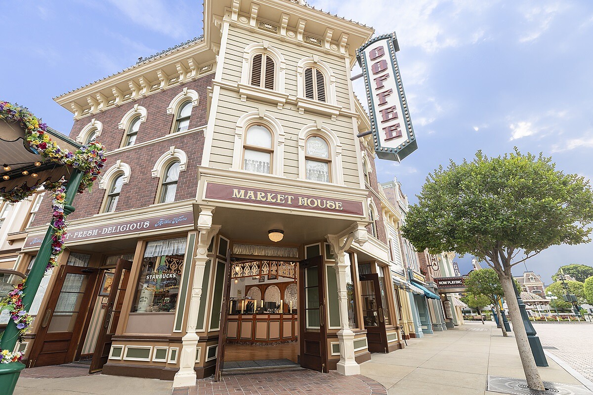 全亞洲第一家迪士尼樂園星巴克就在香港開幕,「市集咖啡店」舊位在園區內的美國小鎮大街上,這棟充滿維多利亞風格的建築物,就是星巴克的所在位置。以仿舊的天然木材搭配柔和燈光,打造傳統咖啡廳的氛圍。
