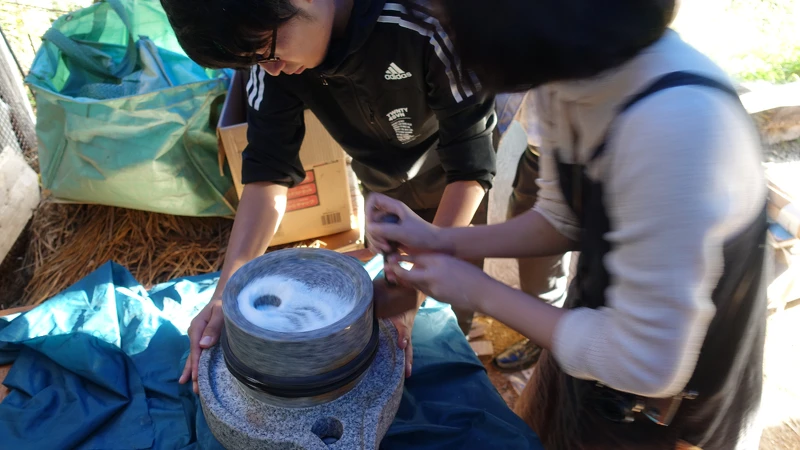 午餐結束後,再度進入山區,來到的是當地神人長崎先生所創建的「夢創塾」自然體驗學校,朝著自給自足的目標前進所建的園區,成為長崎先生建立烏托邦生活的基地,房子自己蓋、發電自己來、燃料自己取,甚至食物也自己栽種狩獵,長崎先生得意地和我們分享,自己也常到台灣、非洲等地農業技術交流,看他眼神中熱血的模樣,這片園區內的一磚一瓦都流著他自信的血液。和紙的製作、牡丹餅以及天然鹽的製作,成果不是重點,而是過程的趣味滿滿。