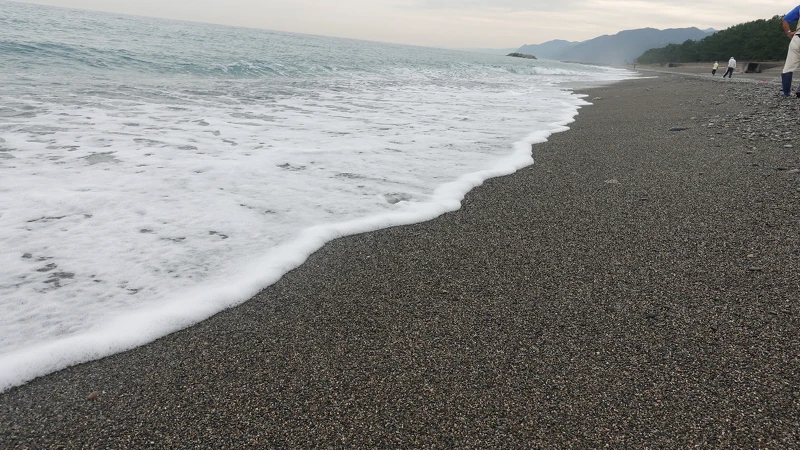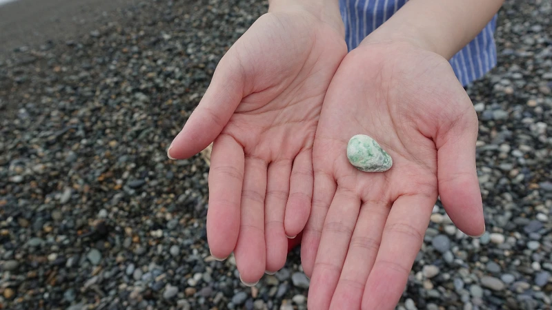 不在九州宮崎,朝日町這裡也有一處「宮崎海岸」,延綿數十公里的海岸上,遍部大大小小的石頭,經過海水的打磨,如卵形以及各式各樣的美麗石頭均在此現身,當然最重要的便是海灘上的翡翠原石,自繩文時代就有在此撿翡翠的紀錄,當時的人們也和現在人一樣,喜愛翡翠的美麗,用以當作裝飾品,跟著扇谷先生的腳步,我們努力地尋找著寶藏,只不過以我們的「酒矸倘賣無」的功力,很難。哈哈哈。不過幸好還有扇谷先生在,才不讓我們空手而歸。