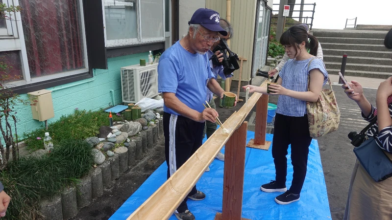 到了午餐時間,體驗製作竹筷竹碗,為的是等等的「流水涼麵」,用水川燙過的素麵,放進有著流水的竹橋上,我們就在一旁用筷子夾麵,手不夠快的話很抱歉,就得餓肚子啦!原來這類的活動也頗受小朋友們的歡迎,每當有校外教學團來訪時,食堂的大姊們就會端出道具讓大夥一邊大快朵頤,一邊享受刺激的樂趣,可惜沒有品嘗到當地知名的鱈魚湯,大概是為了我們下回再訪預留伏筆。早上還有大太陽,怎麼一到下午便開始下起微微細雨。