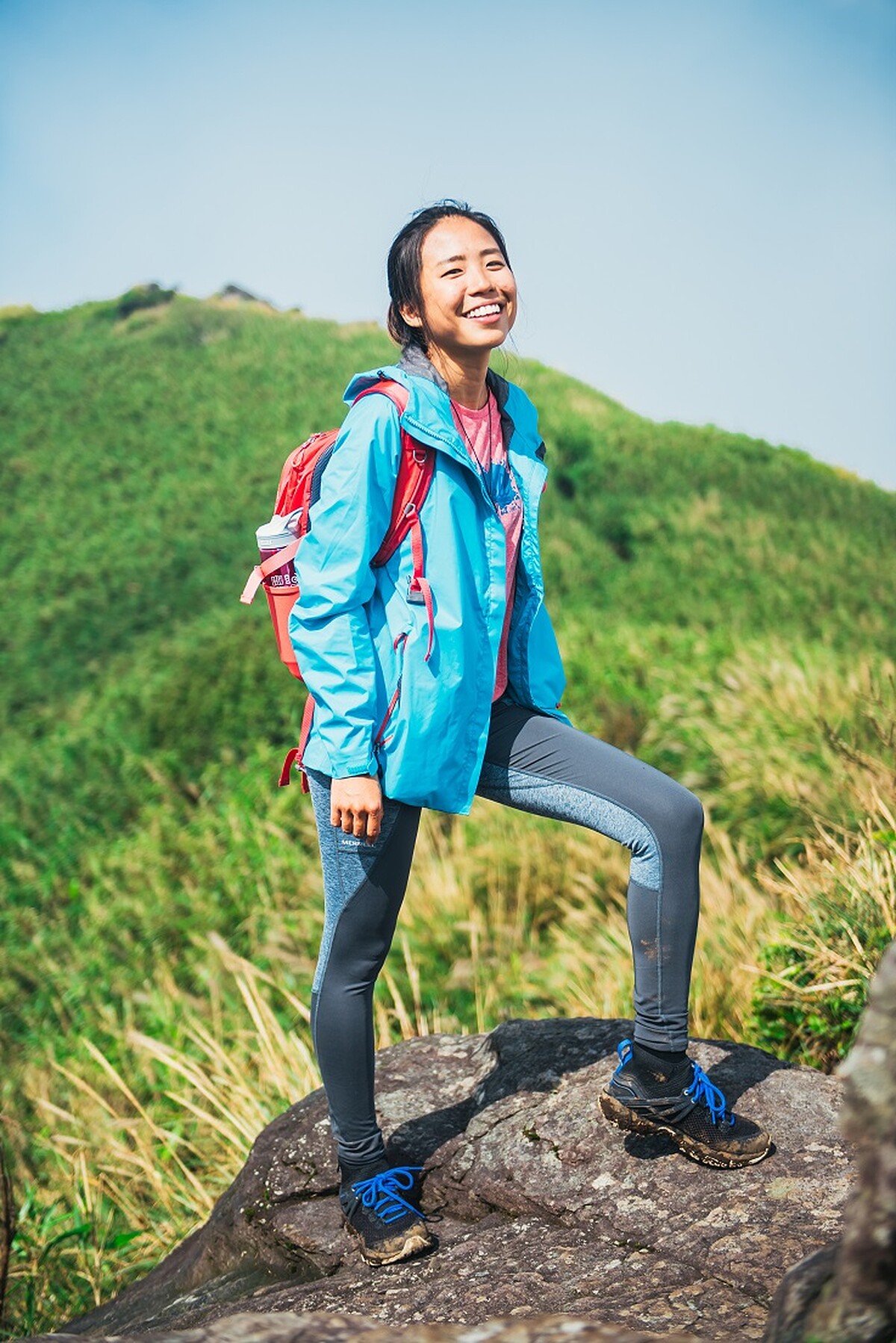 CC說:「山上的氣候本來就捉摸不定,這款FALLON 防水透氣外套,就算是夏天我也會穿著爬山,因為山區植物大多是倒鉤刺生長的型態,穿短袖很容易被刮到手臂,不過這件透氣的機能設計完全不感到悶熱,防水機能也很優異,對我自己來說是四季爬山都會是必備的穿著;加上剪裁合身以及亮眼的配色,對愛美的女生來說可以讓爬山穿搭更有時尚混搭感,輕盈又好收納,也是我個人很推薦的原因。」