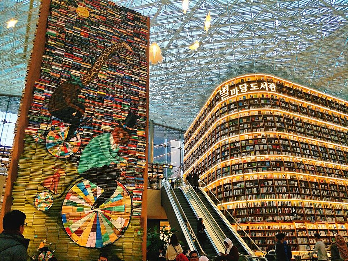 「星光庭院圖書館」 (별마당도서관)巨大的書牆與藏書,讓人真的是感受到知識龐大的魅力阿。總面積達到2800平方公尺,高度約兩層樓,以高達13公尺的三座大書櫃為軸心,一共收藏5萬餘本雜誌圖書,完全免費借閱,任何人來此,只要選一本自己喜歡的書,都可以在座位區享受悠閒的閱讀時光。