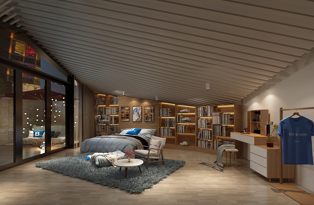 別出心裁營造的書屋居家空間:有綠意清新的花園拱廊梯、寬敞畫室,以及開放式與愛書人共享的咖啡空間,頂層區域還有隱密於書牆之中的主臥室和露臺,各區域以簡約卻不乏巧思的設計風格裝飾而成,讓旅客能在靜謐的書香中,透過玻璃天頂仰望星空,擁抱一夜好夢。