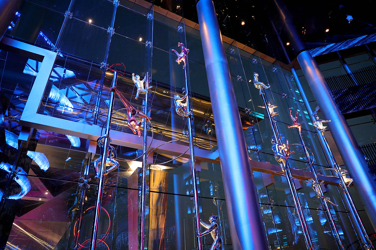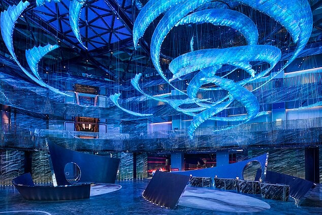 (西安W飯店大廳空中、懸浮17公尺高的抽象玻璃漩渦,擁有帶領旅人穿越時空的奇妙視覺感。)