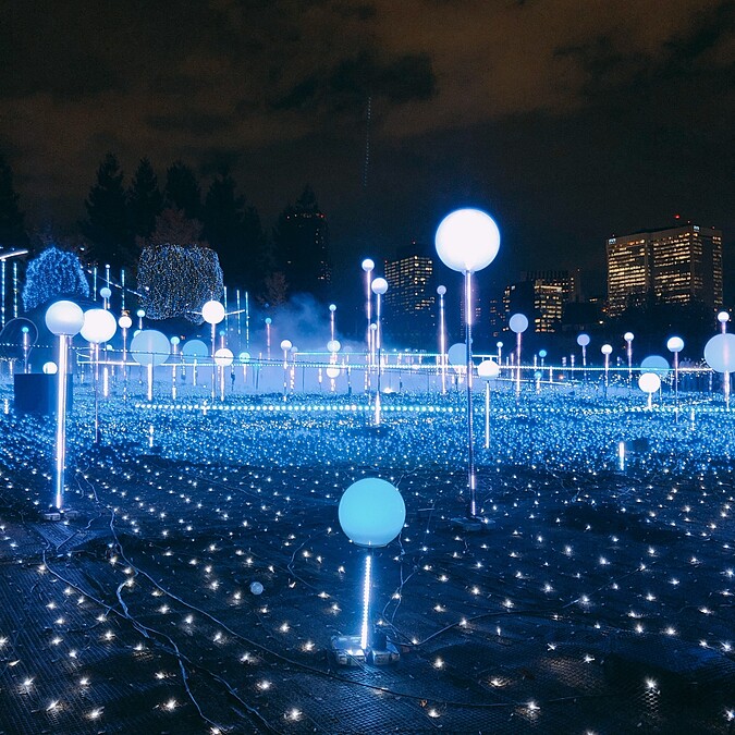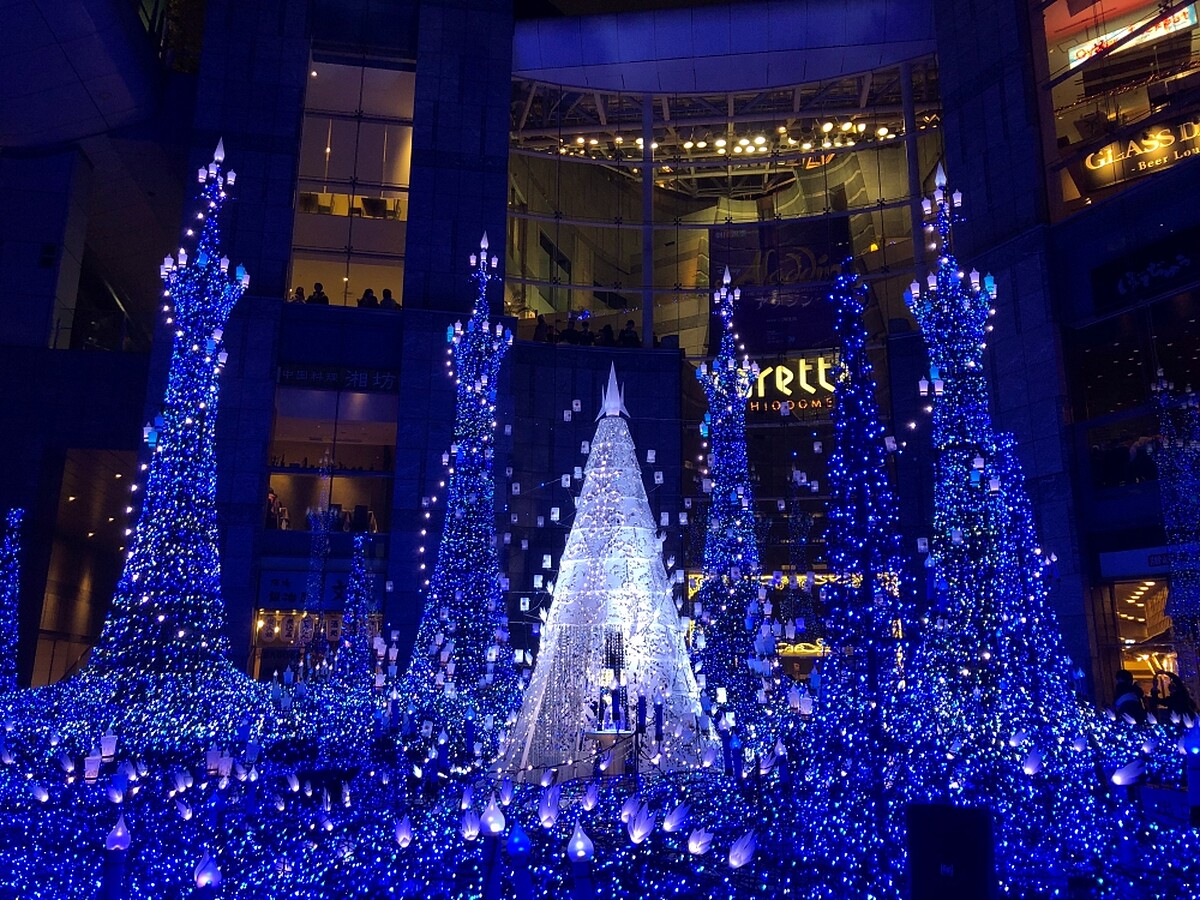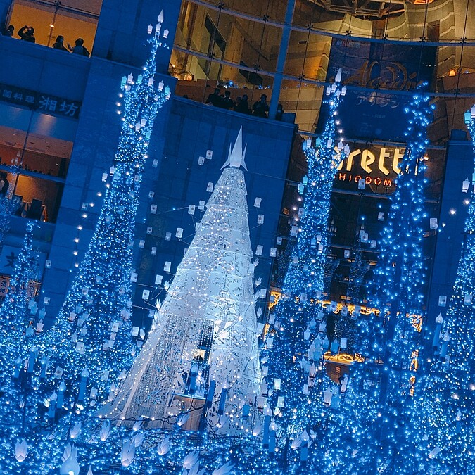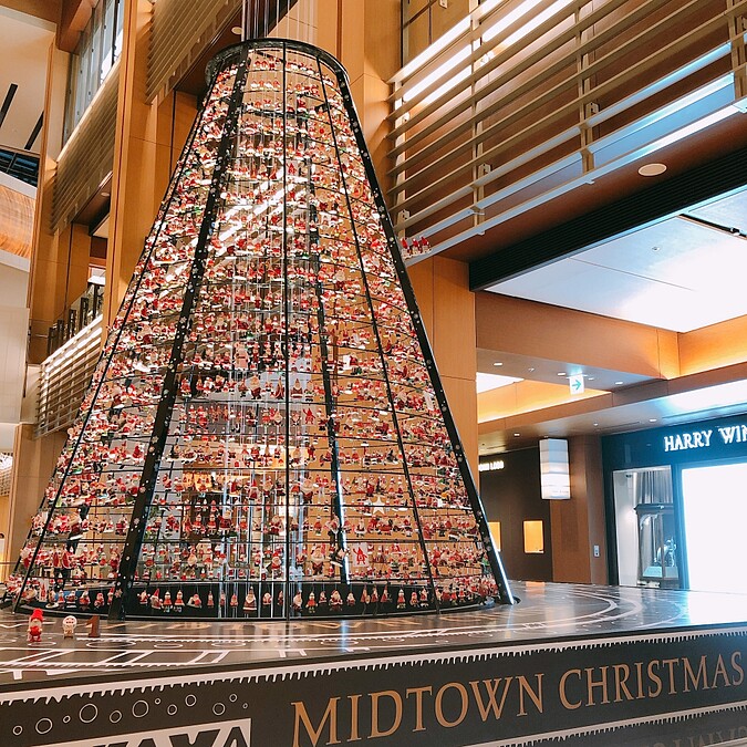 同樣也位於六本木的東京中城(Tokyo Midtown),今年點燈相當值得一看,主題是以宇宙空間為印象的星空花園,而且處處充滿細節巧思,比如在大門入口處就矗立著可愛的聖誕老公公聖誕樹。